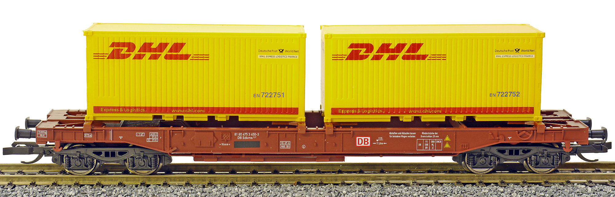 | nízkostěnný nákladní vůz červenohnědý se dvěma kontejnery 20' „DHL“ |