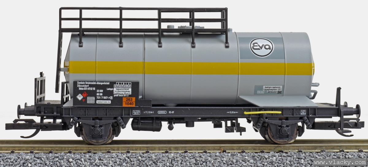 | cisternový vůz světle šedý se žlutým pásem „EVA“ |