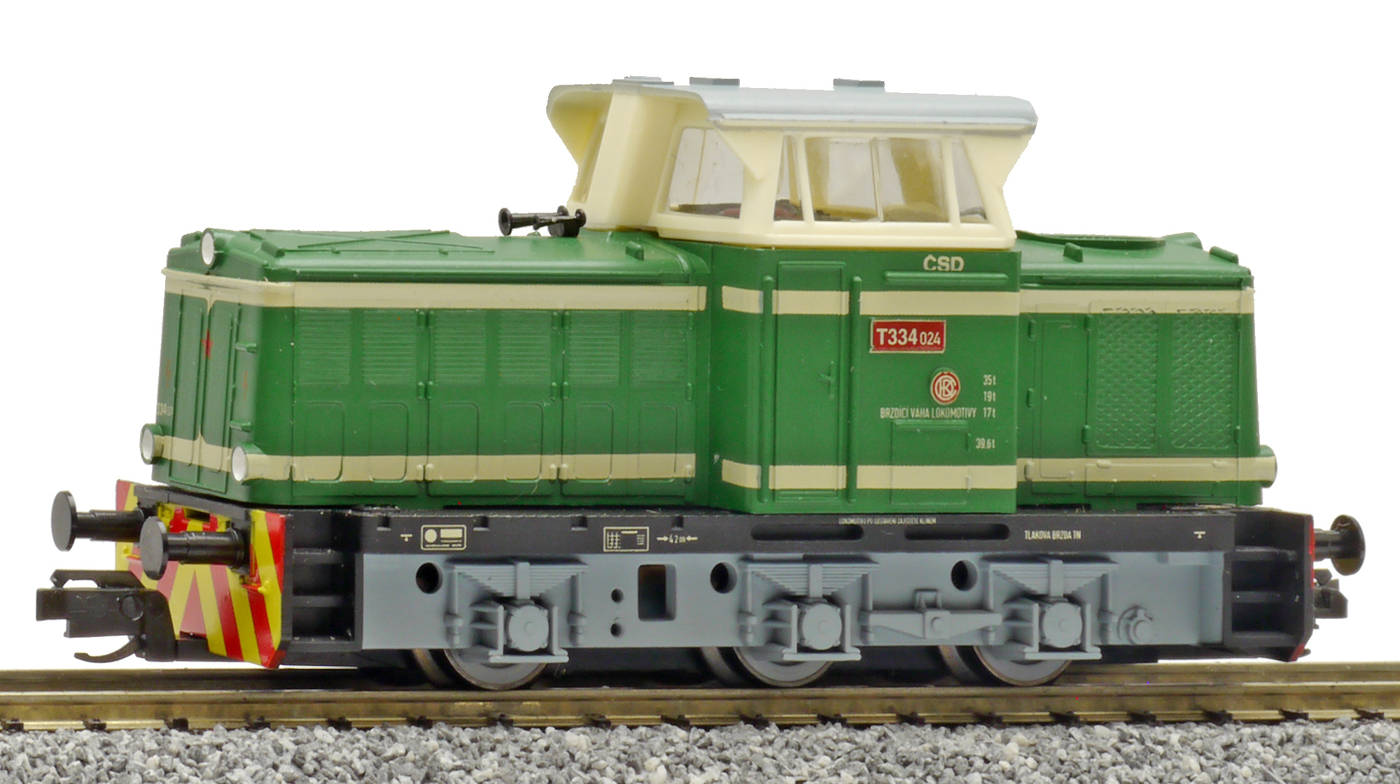 | dieselová lokomotiva zelená s krémovými pruhy, černý rám a šedý pojezd |