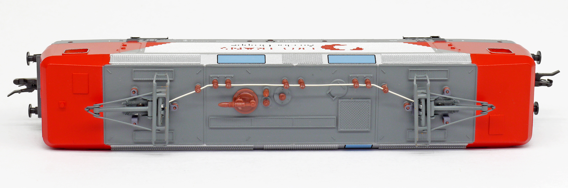 Popis   elektrická lokomotiva červená-stříbrná s tmavěšedým rámem a hnědými podvozky „EKOTRANS“