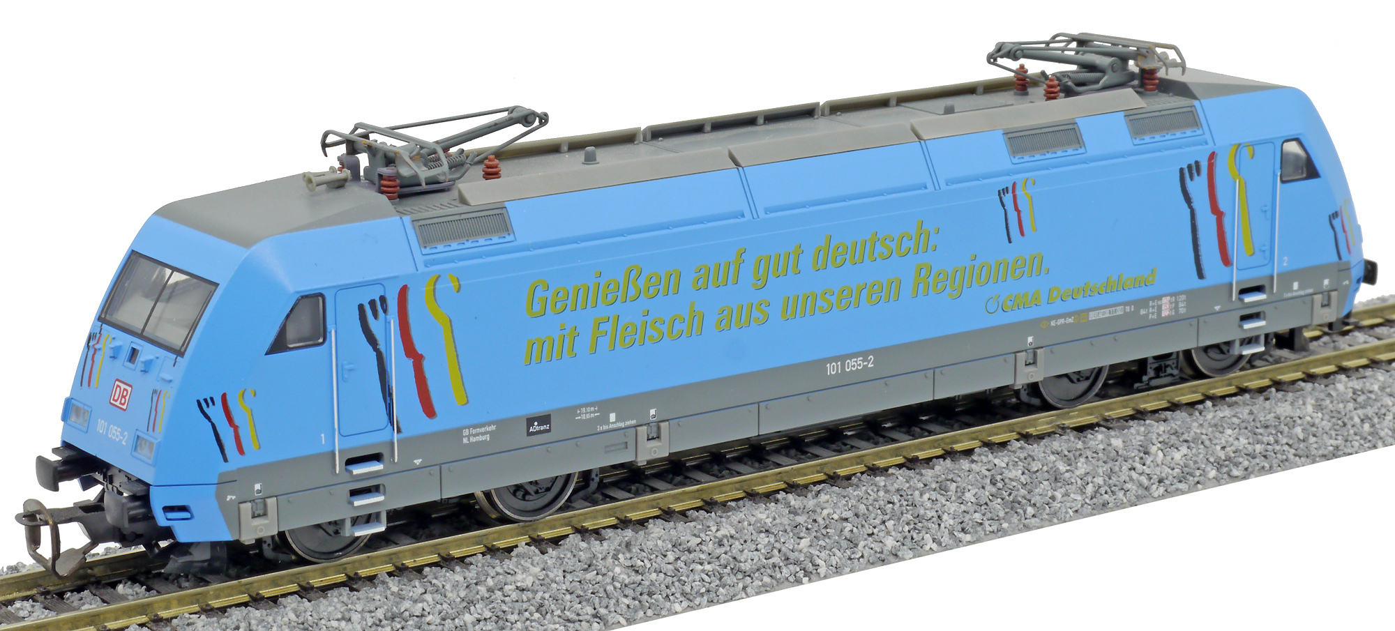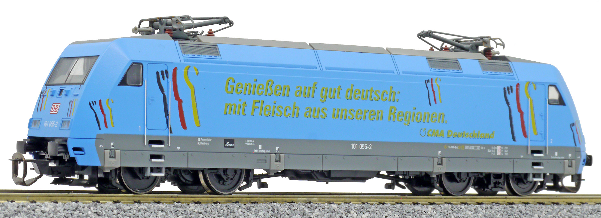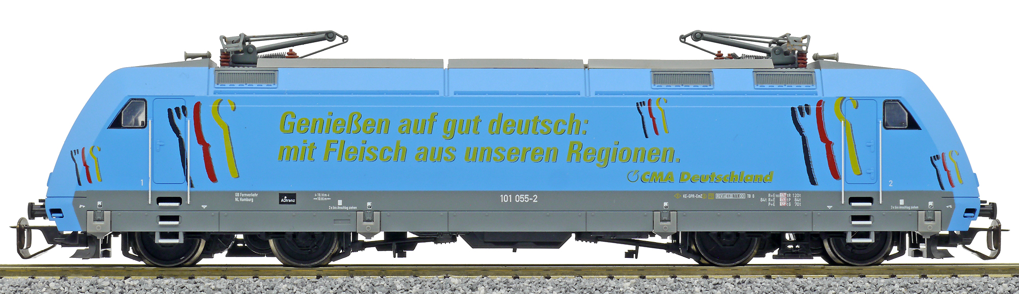 Popis   elektrická lokomotiva modrá s reklamním potiskem „Fleischwerbung“