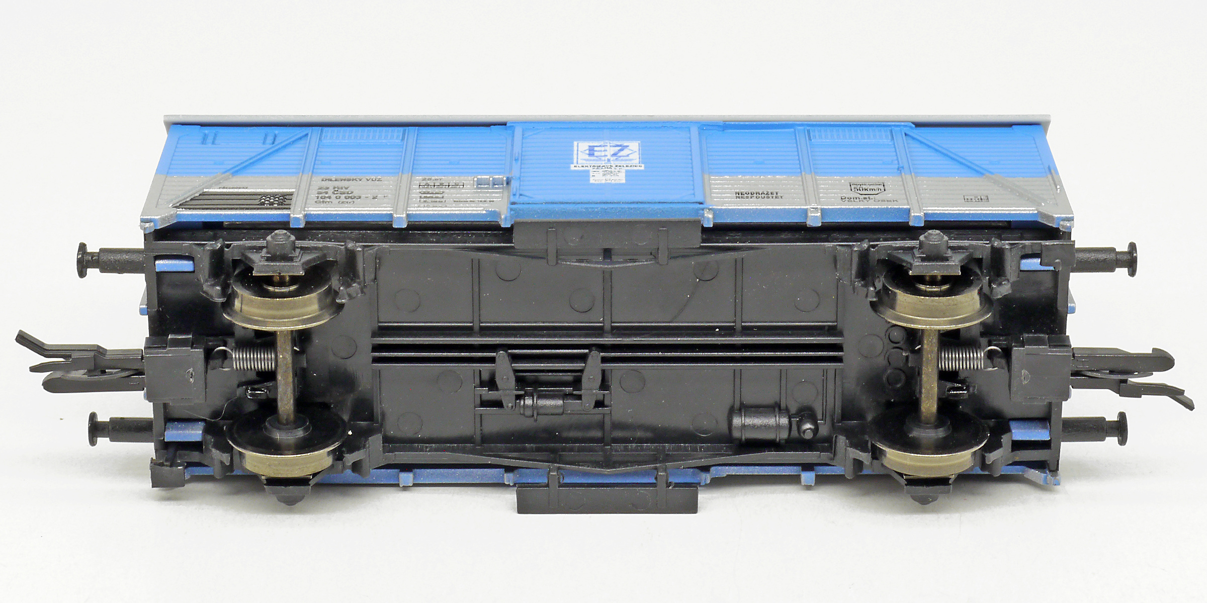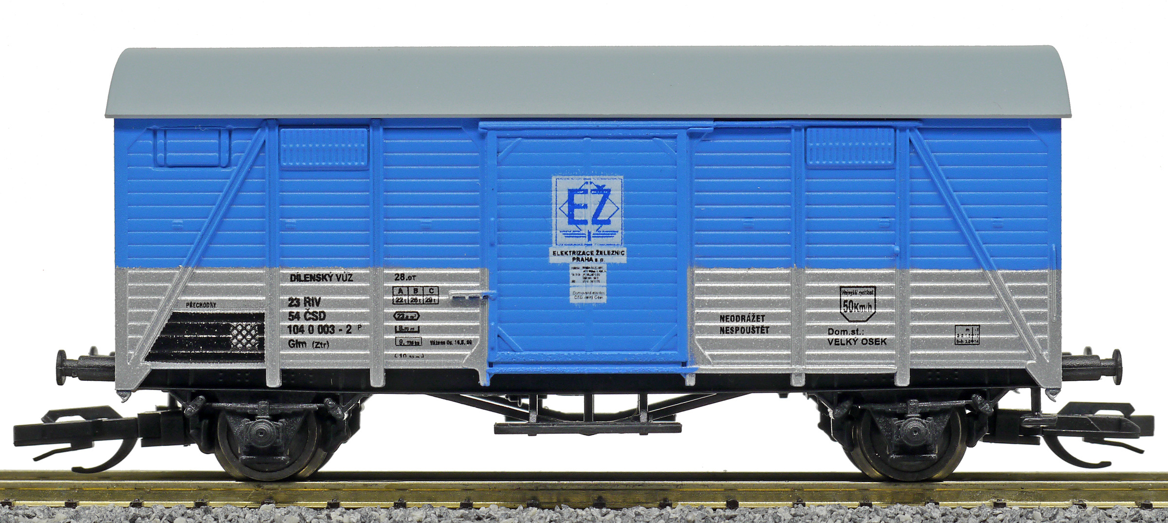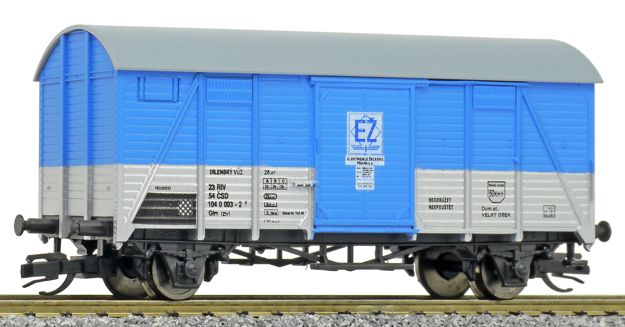 | krytý nákladní vůz modrý-stříbrný s šedou střechou dílenský vůz „Elektrizace železnic“ |
