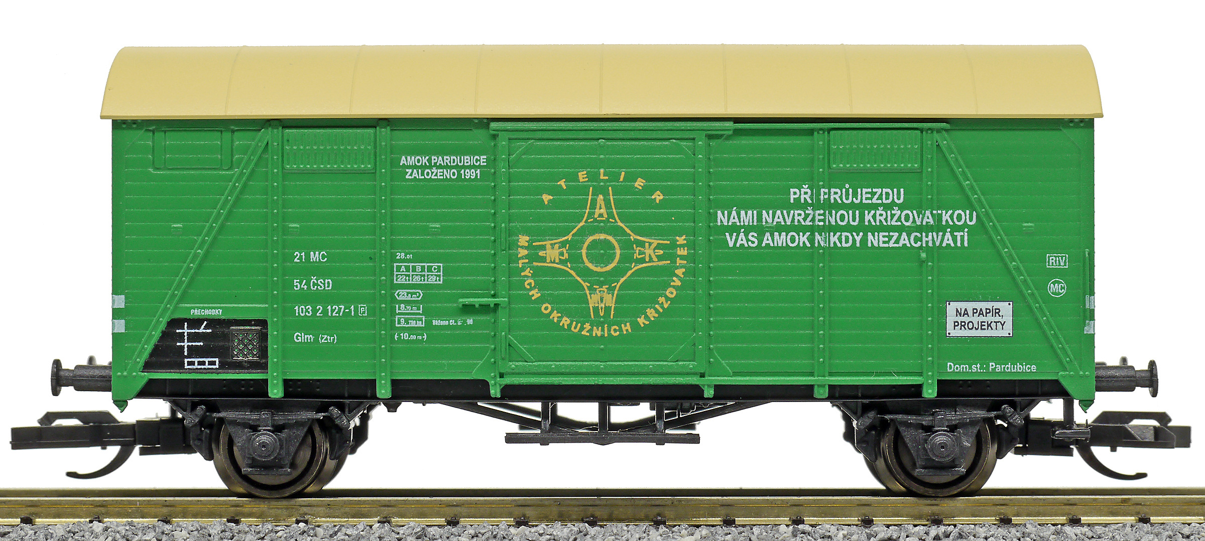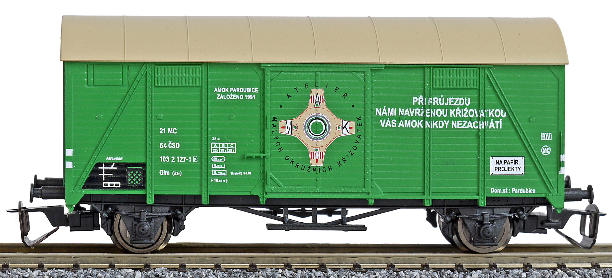 | krytý nákladní vůz zelený s krémovou střechou a reklamou „AMOK” |
