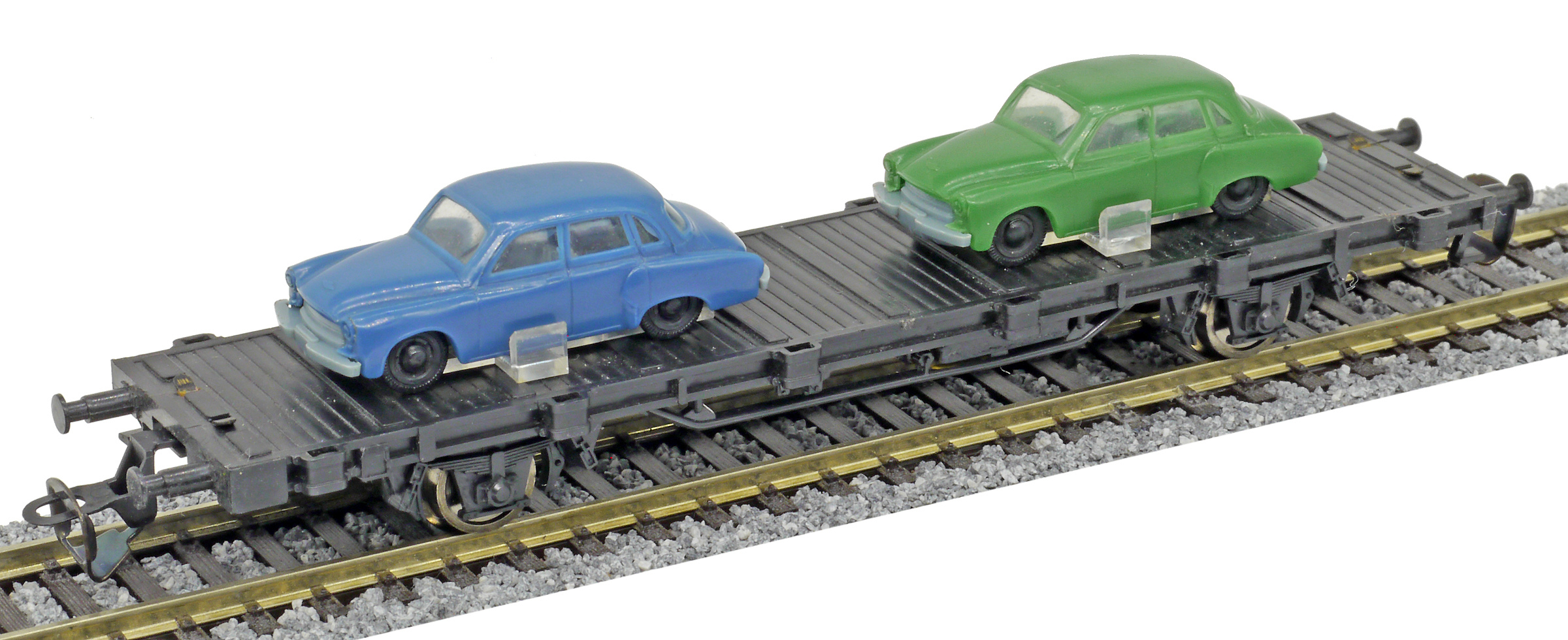Popis   plošinový nákladní vůz černý s nákladem dvou osobních automobilů Wartburg