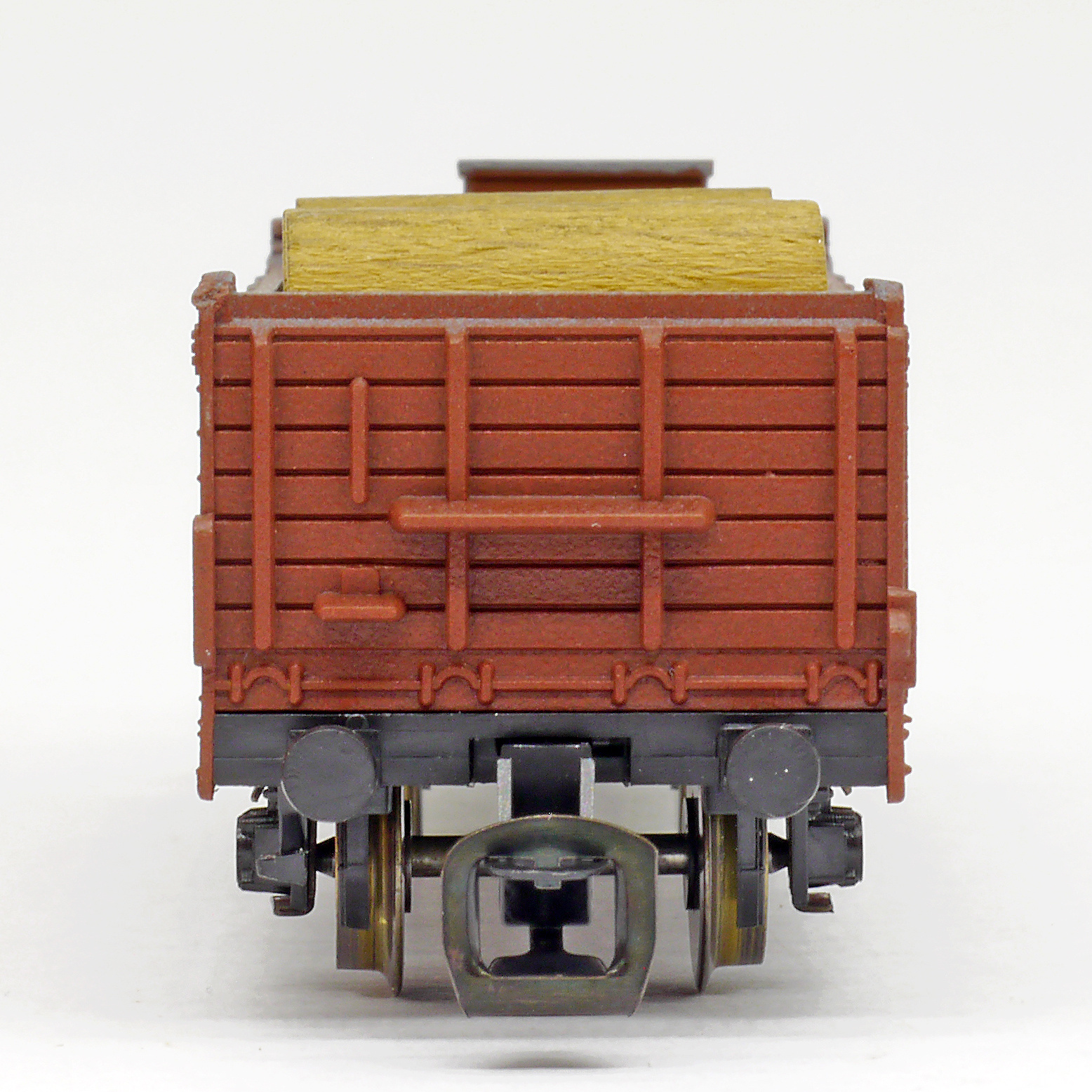 | otevřený nákladní vůz červenohnědý s brzdařskou budkou a nákladem kulatiny |