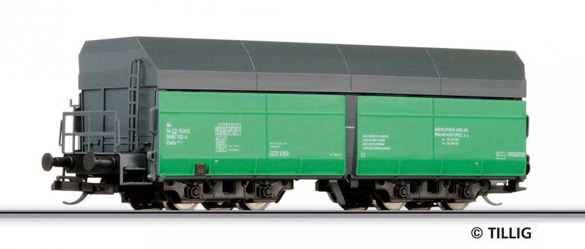 | nákladní samovýsypný vůz černý se zelenými klapkami „Sokolovská Uhelná a.s.“ |