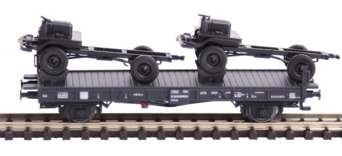 | set čtyř plošinových vozů (ex Villach) s nákladem podvozků nákladních aut Robur |