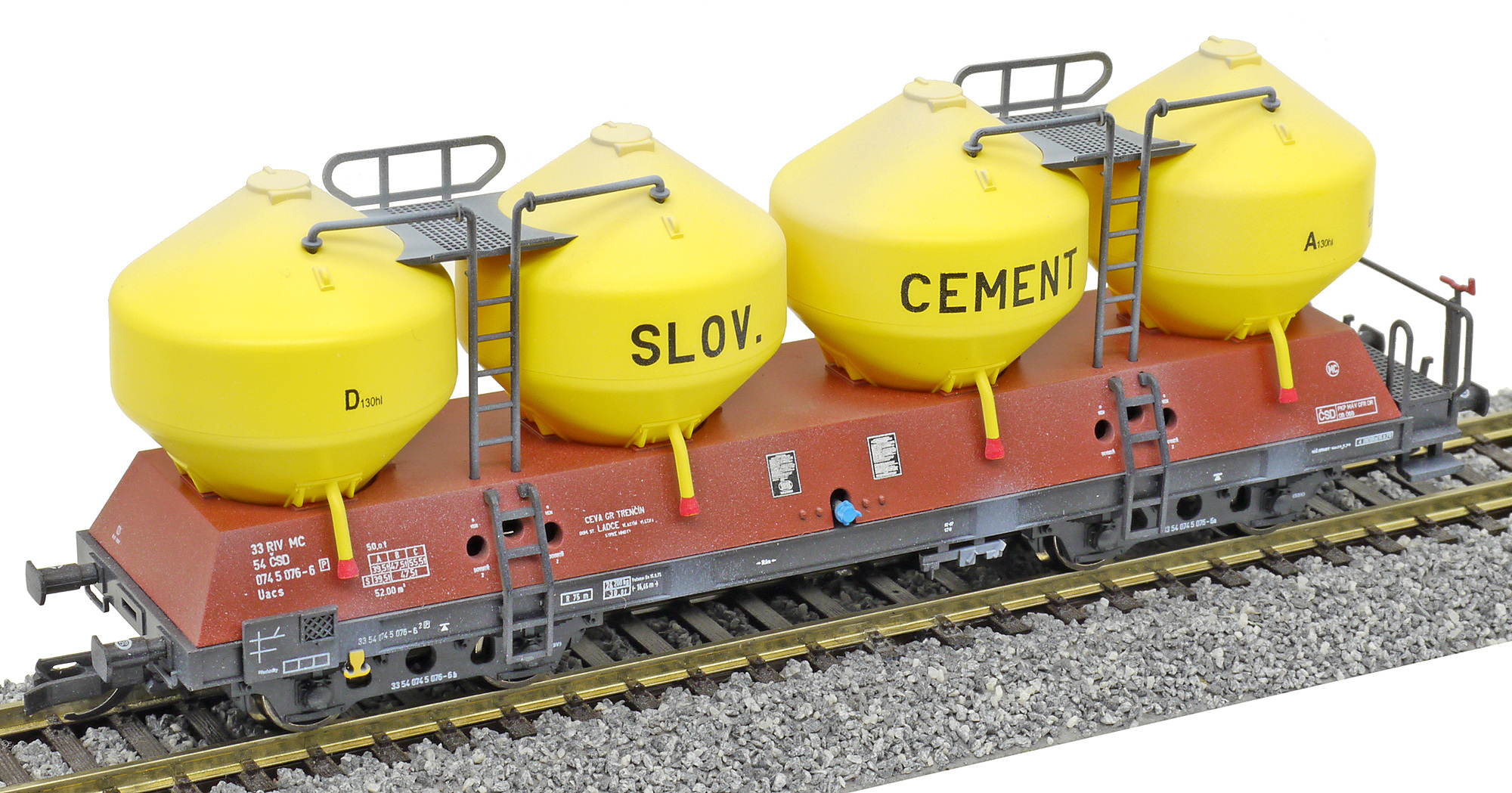 | nákladní samovýsypný vůz červenohnědý se žlutými nádobami „SLOV. CEMENT“ |