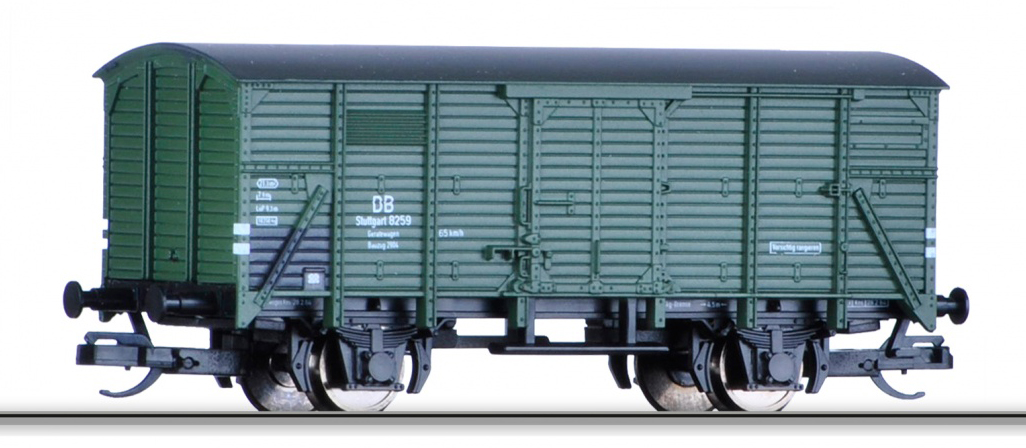 | krytý nákladní vůz zelený s tmavě šedou střechou do stavebního vlaku „Bauzug“ |