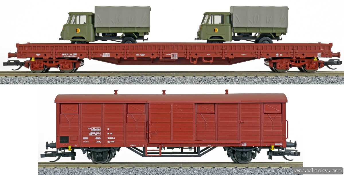 | nízkostěnný nákladní vůz červenohnědý s nákladem vojenských vozů „Militärtransport“ |