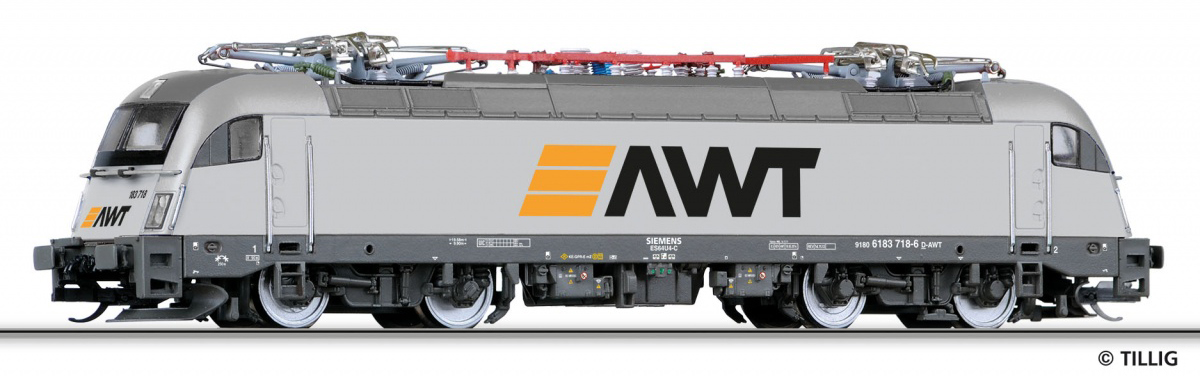 | elektrická lokomotiva světle šedá s černým rámem a pojezdem „AWT“ |