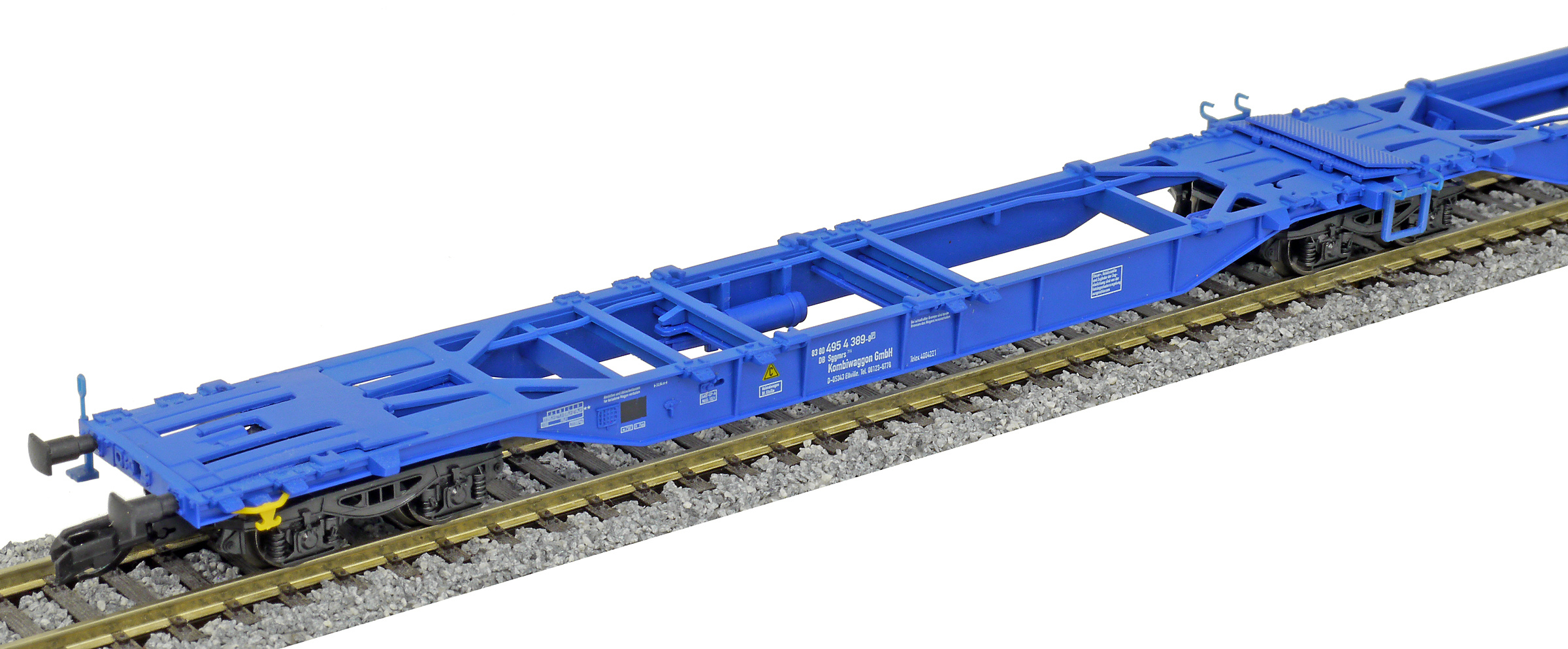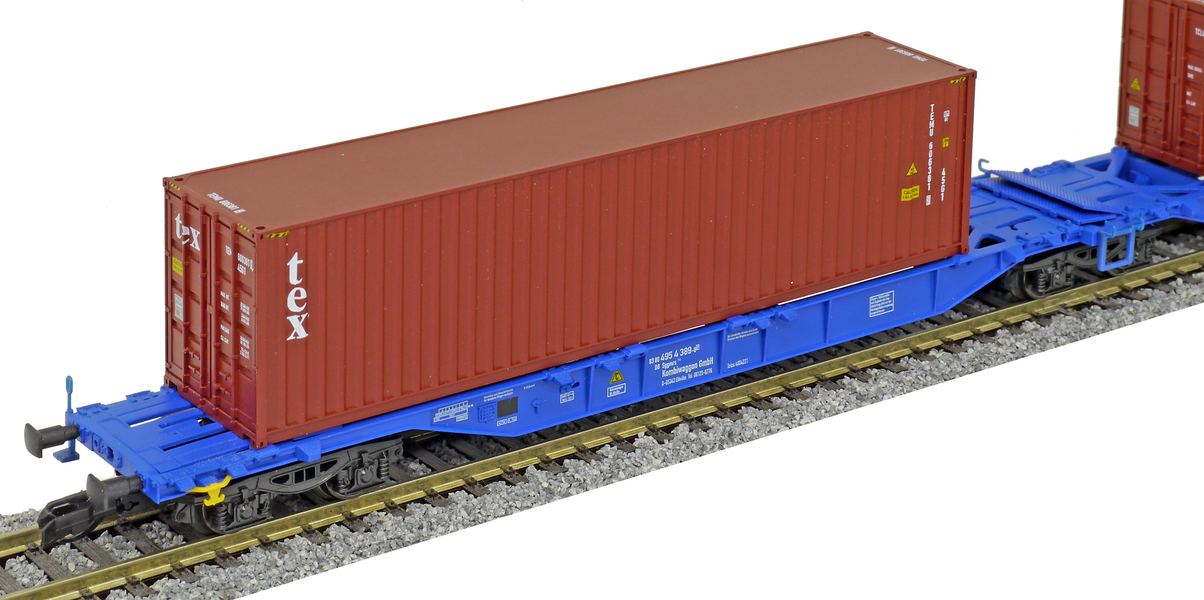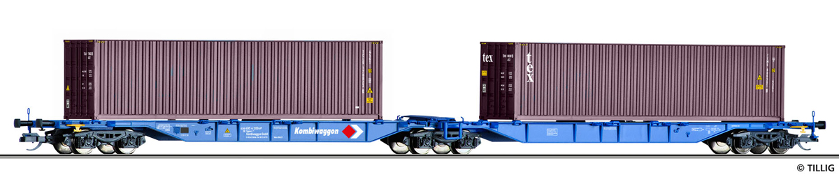| dvoudílný kontejnerový vůz modrý „Kombiwaggon“ se dvěma kontejnery |