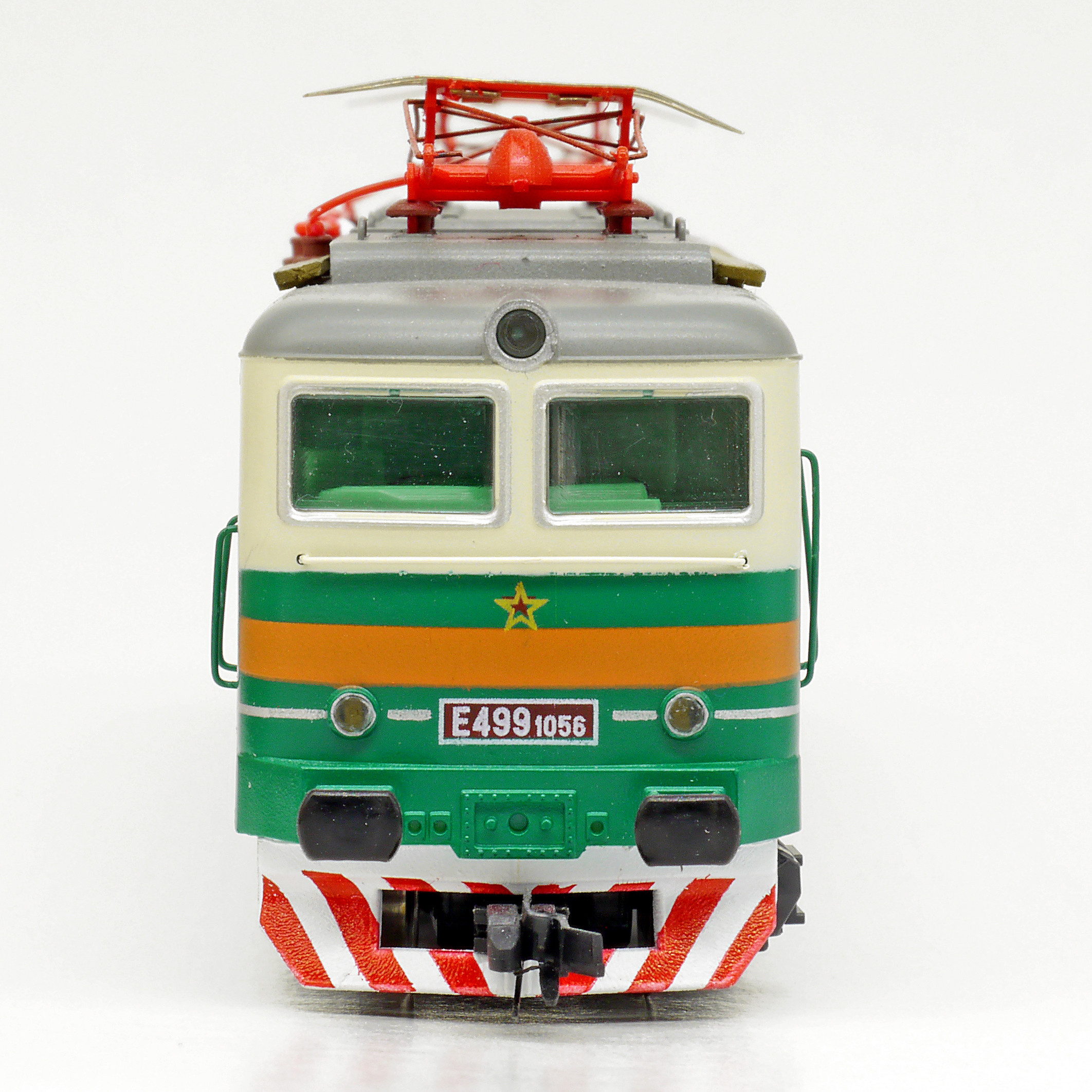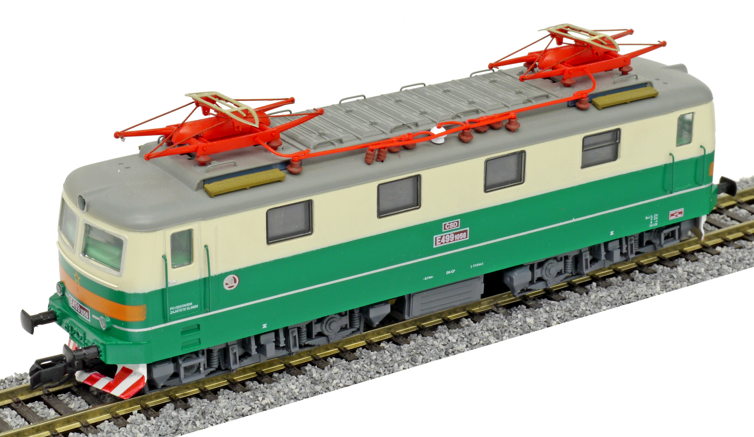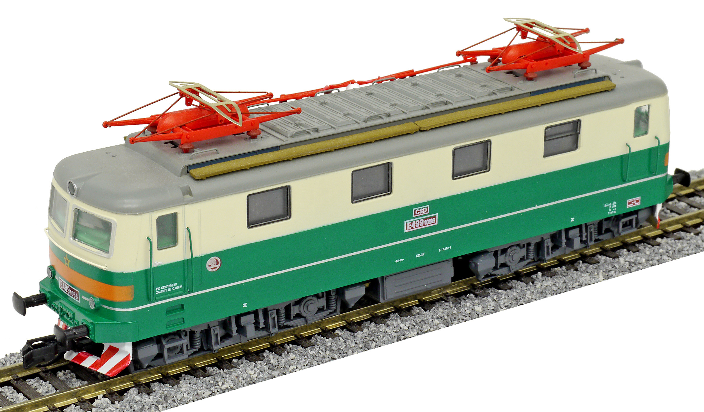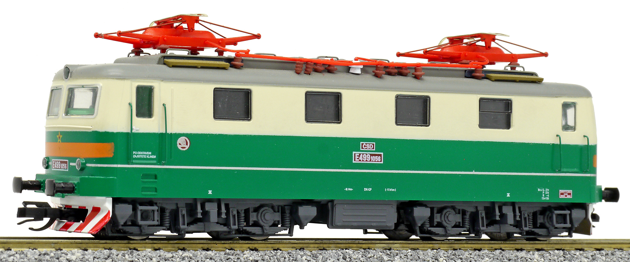 | elektrická lokomotiva zelená-slonová kost, šedá střecha, oranžový výstražný pruh |