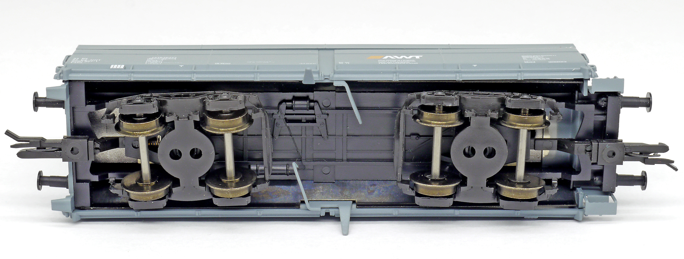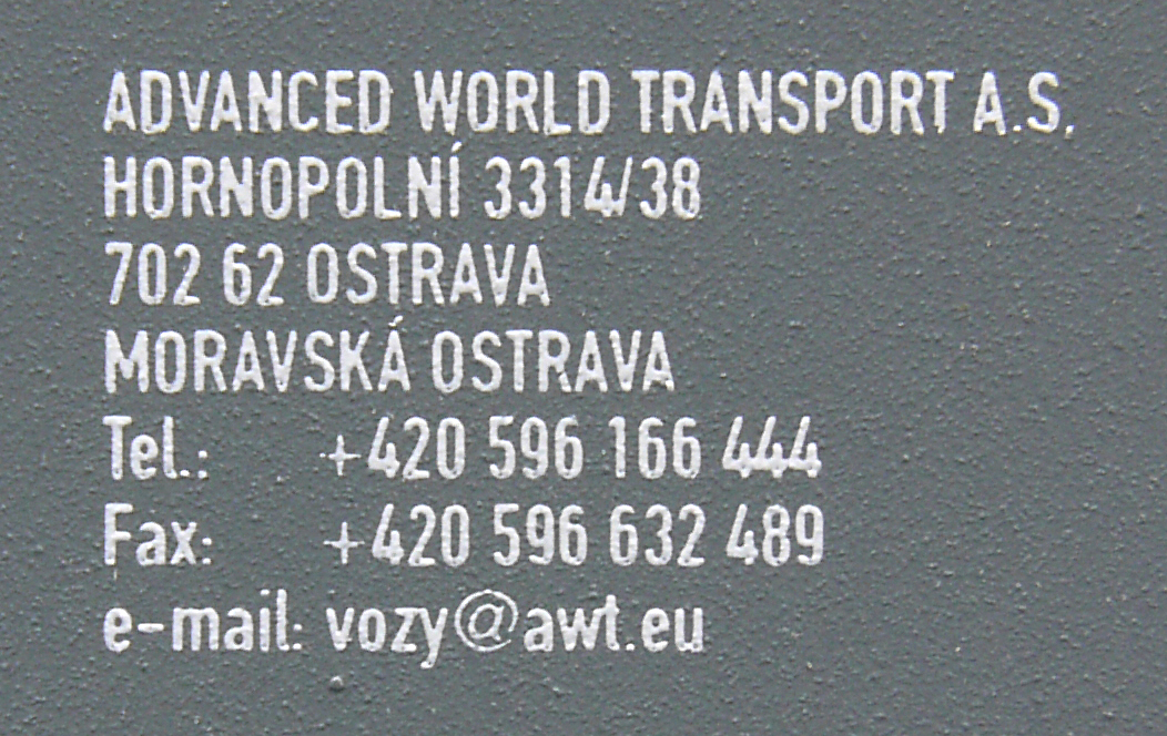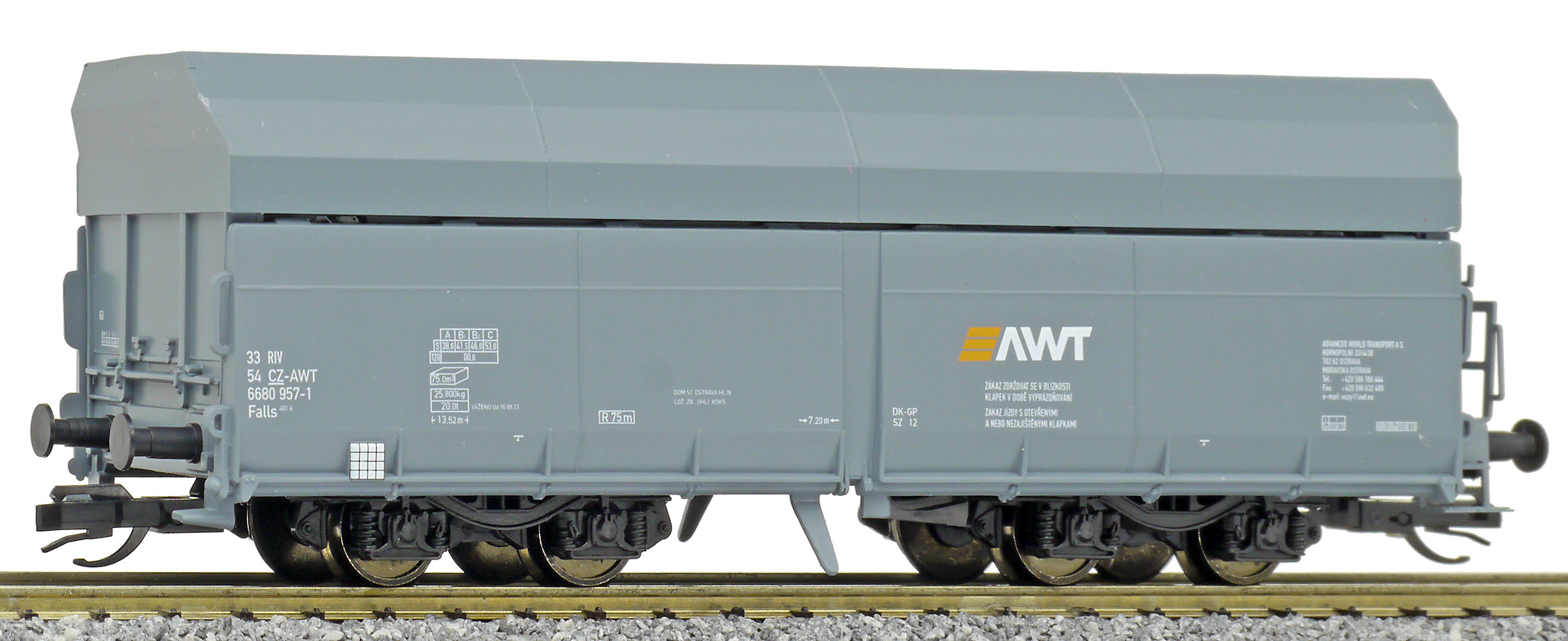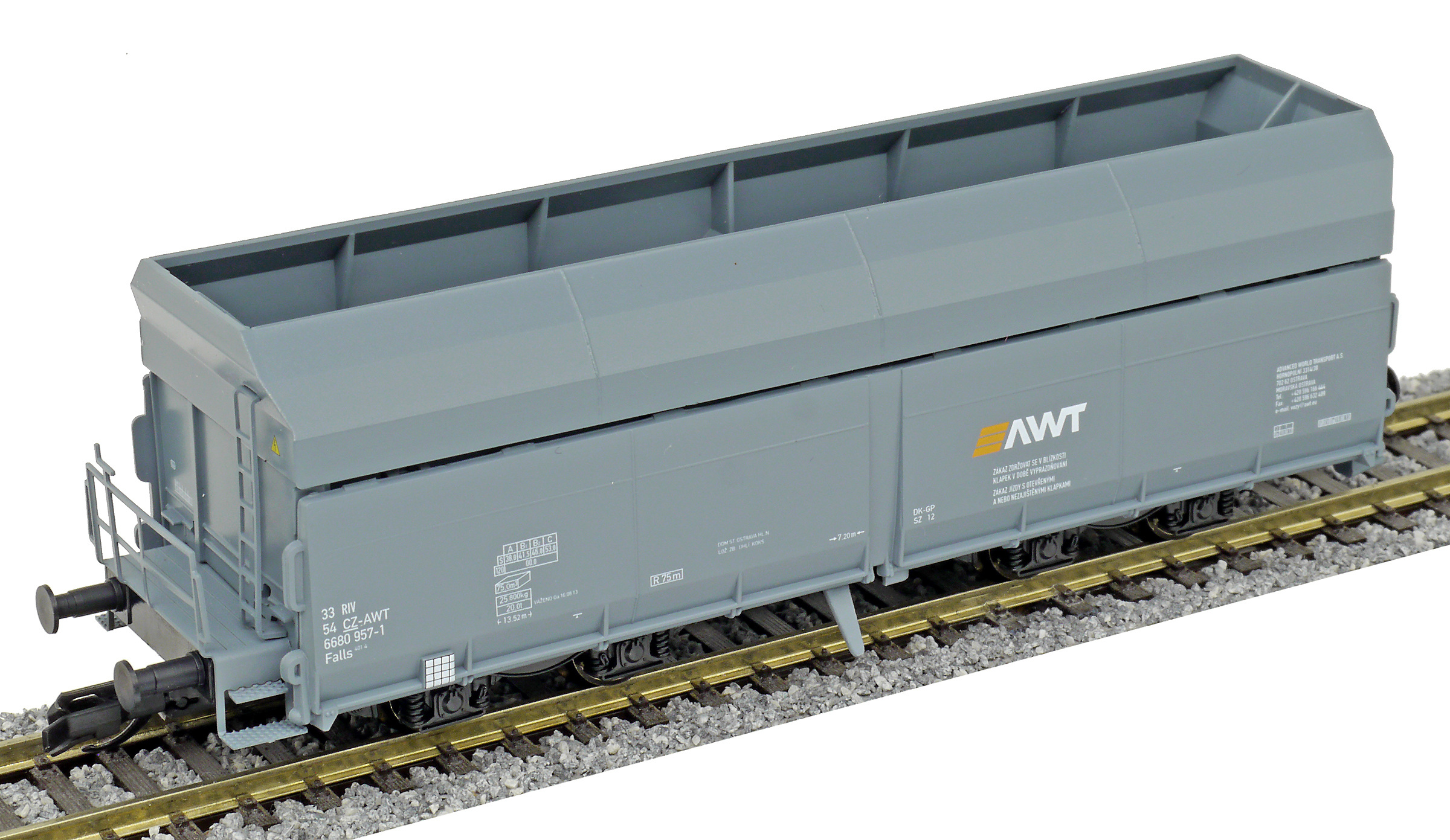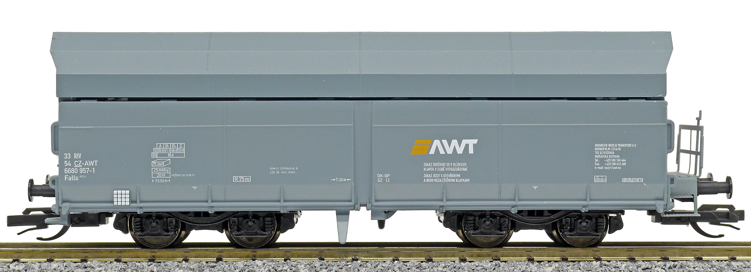 | nákladní samovýsypný vůz šedý s logem „AWT“ |
