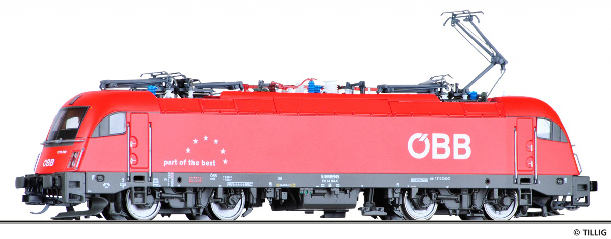 | elektrická lokomotiva červená s tmavě šedým šedým rámem a pojezdem a logem ÖBB |