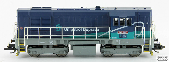 | dieselová lokomotiva v modrém barevném schematu „Unipetrol Doprava“ |