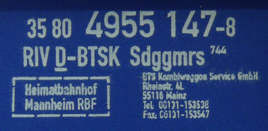 | • 35 80 4955 147-8 | → | nákladní, s podvozky, pevný rozchod, pronajatý vůz, RIV, PPV |