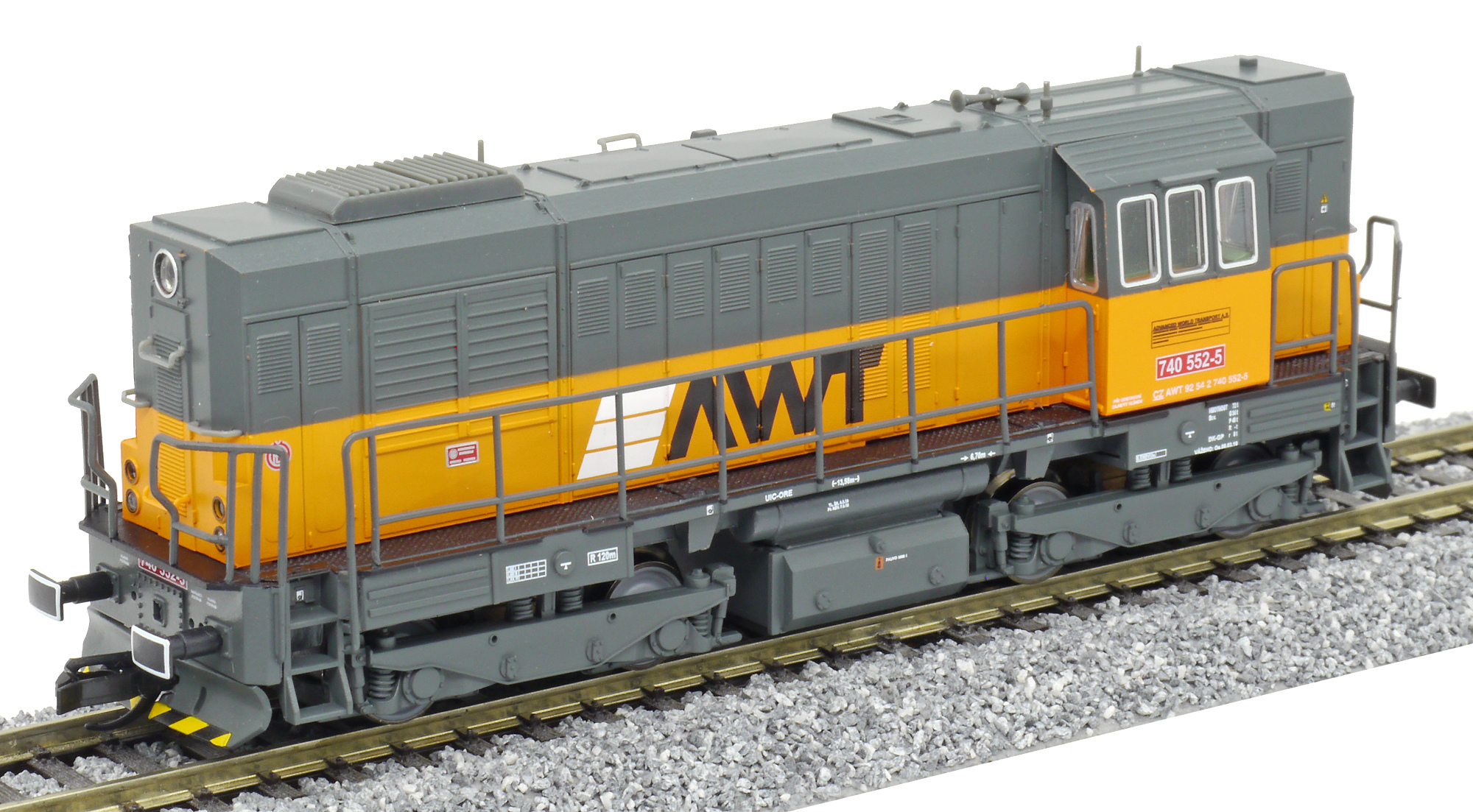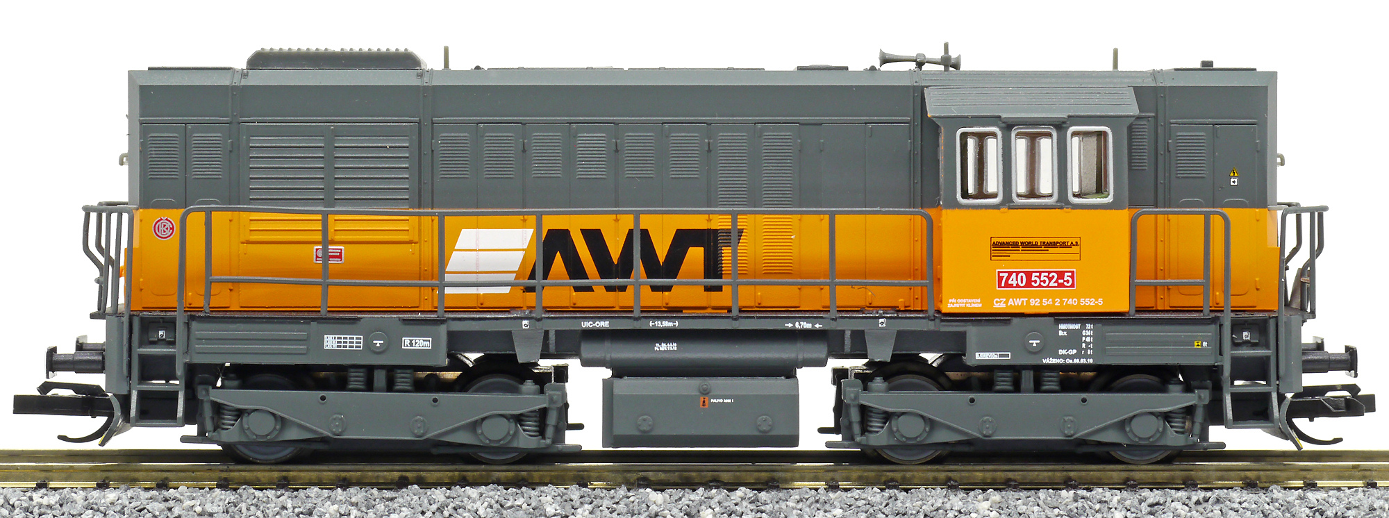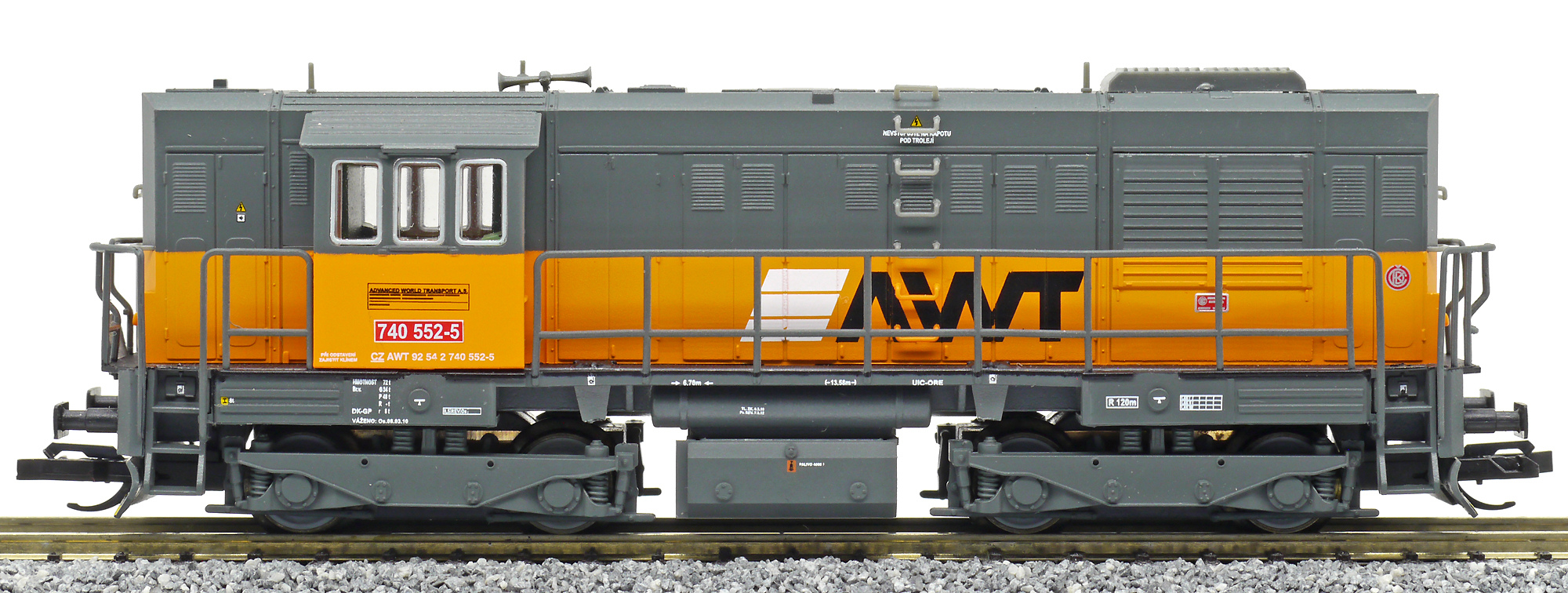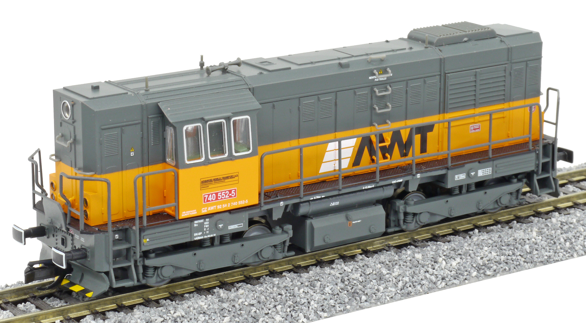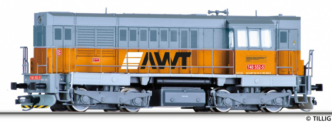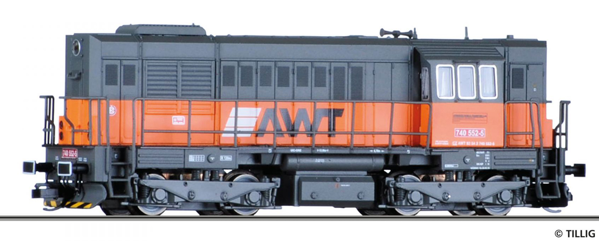 | dieselová lokomotiva šedá s oranžovým pásem a logem „AWT“ |