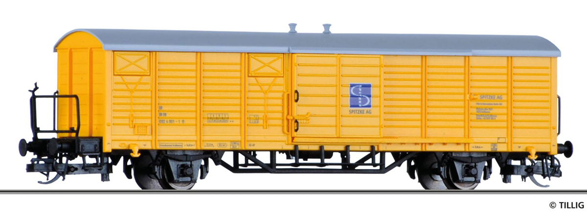 | krytý nákladní vůz žlutý s šedou střechou do pracovního vlaku „Spitzke AG“ |