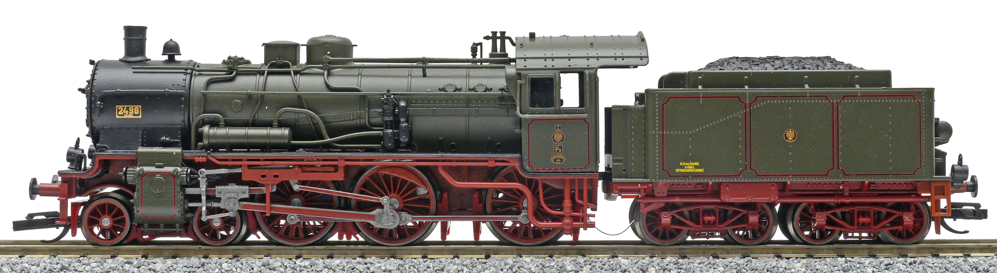 | parní lokomotiva tmavě zelená s červeným pojezdem |