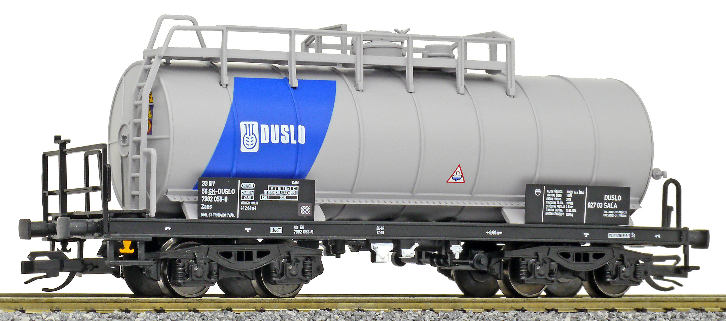 | kotlový vůz šedý s modrým pásem a s logem „DUSLO“ |