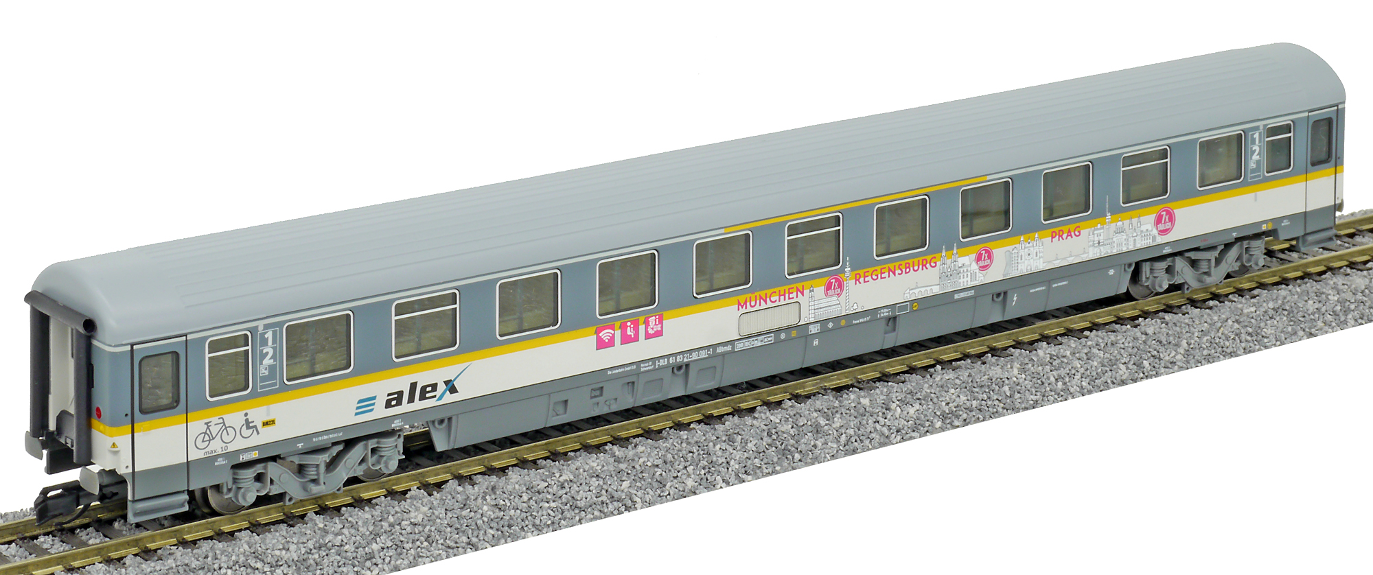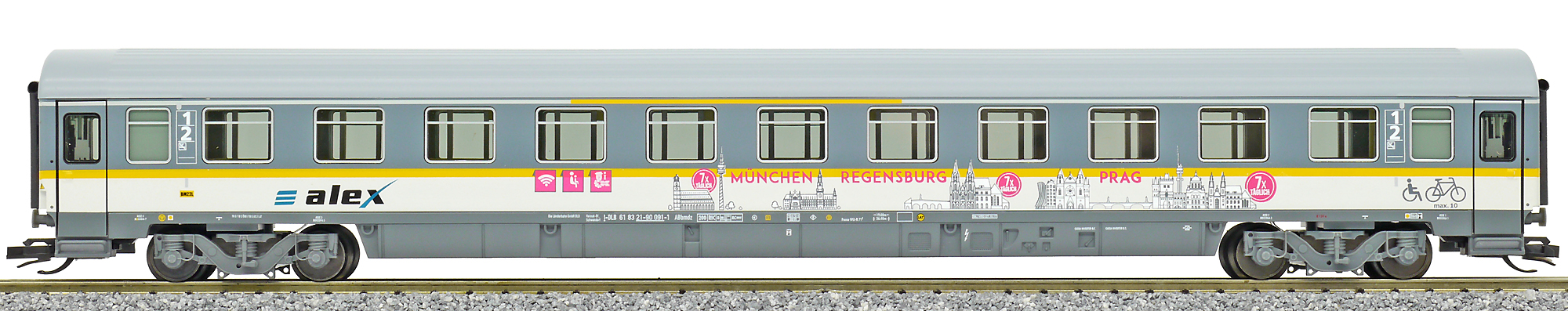 | rychlíkový vůz v barevném schematu „alex“ 1./2. tř. |
