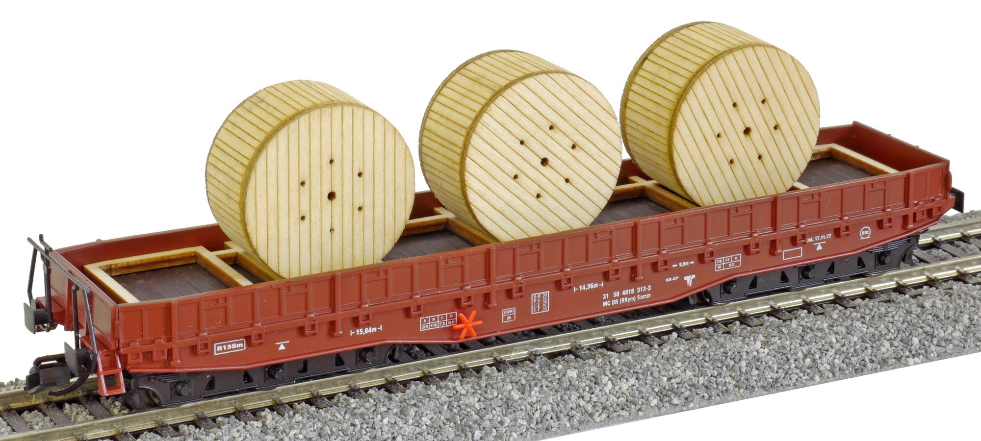 | nízkostěnný nákladní vůz červehonědý s nákladem kabelových cívek |