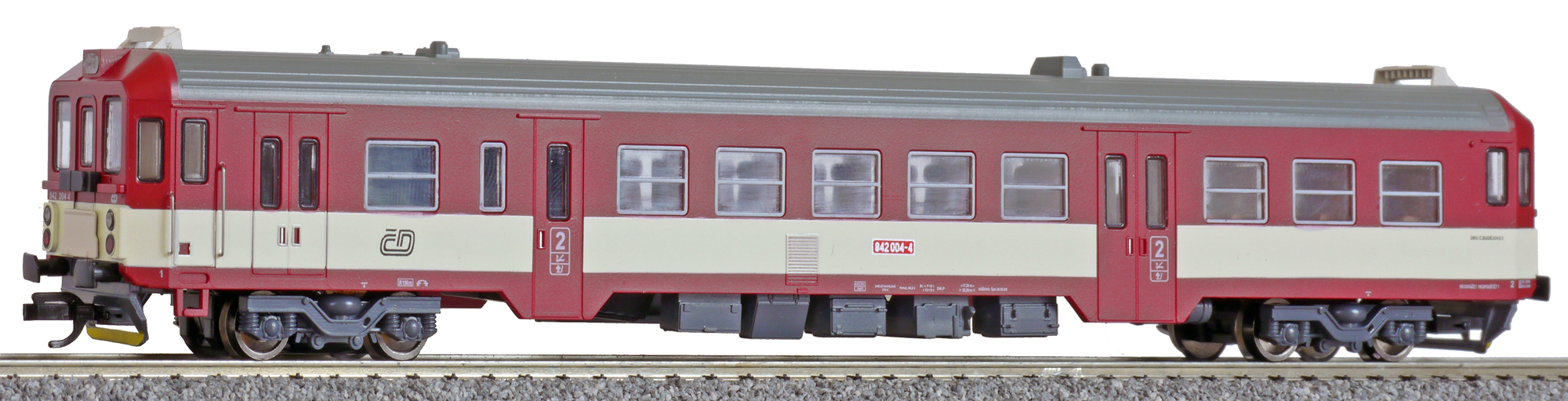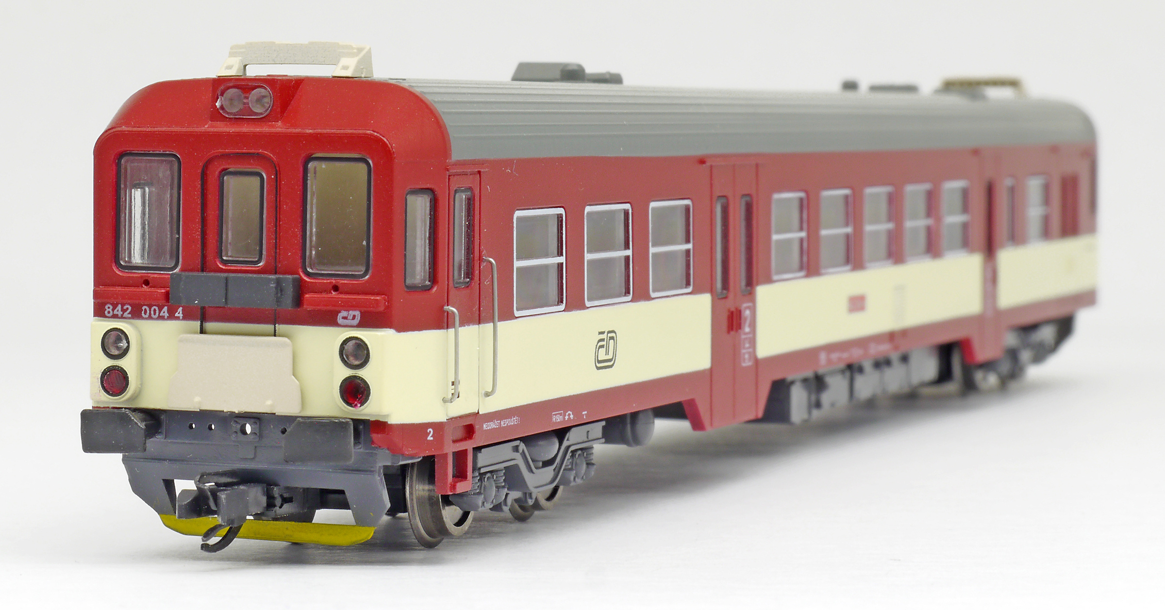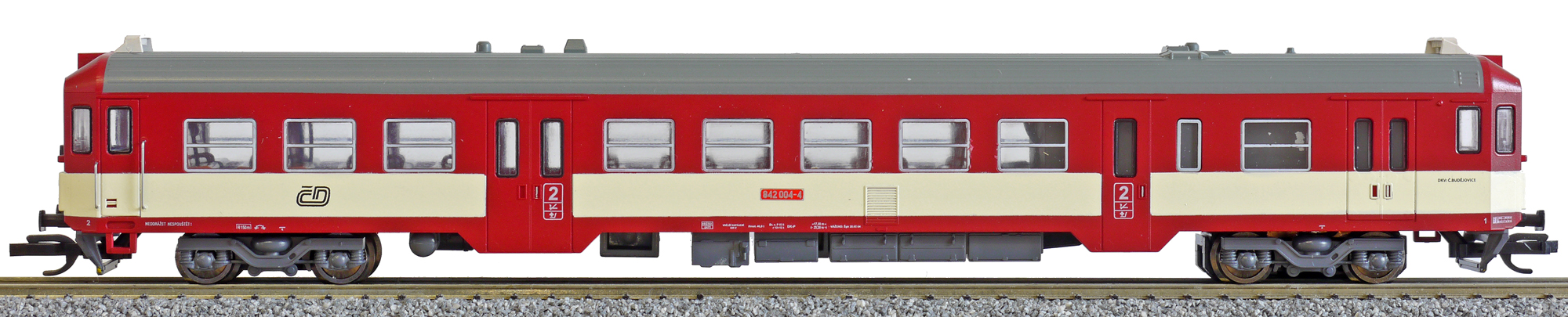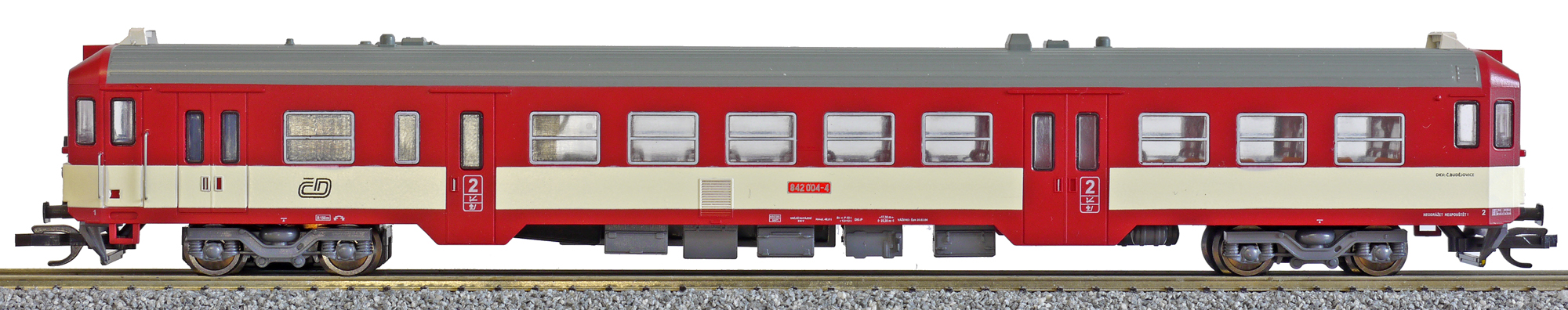 Popis   motorový vůz červený-slonová kost s šedou střechou