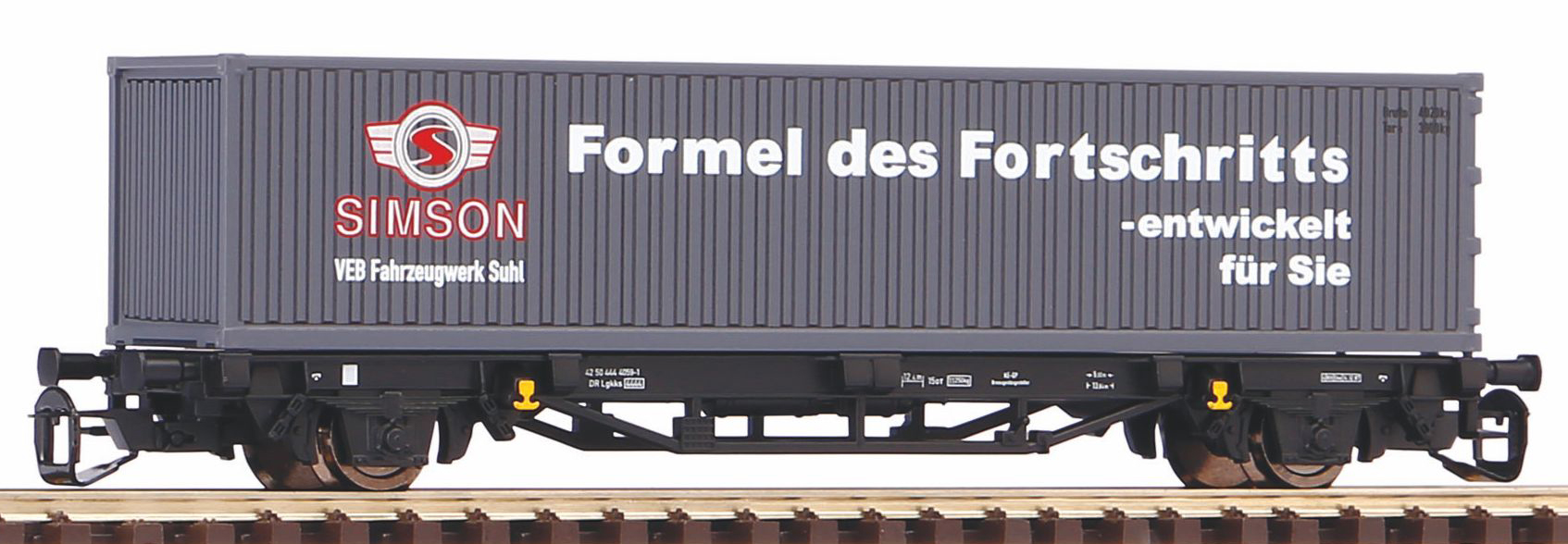 | plošinový nákladní vůz černý s nákladem 40' kontejneru „Simson“ |