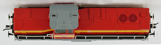| dieselová lokomotiva červená s výstražným pruhem, šedá střecha, rám a pojezd |