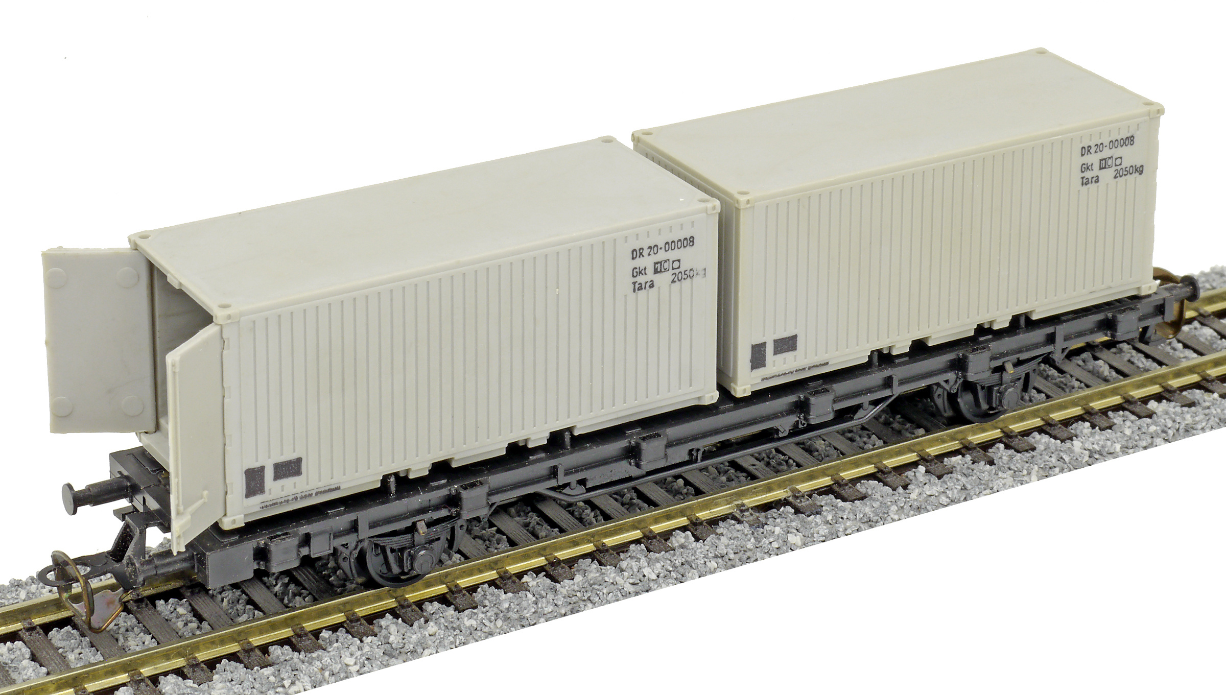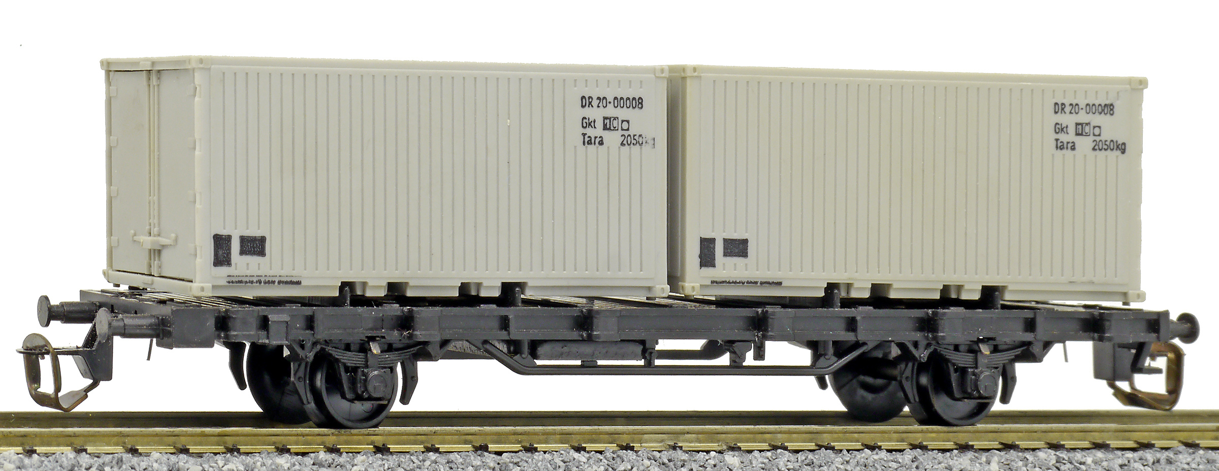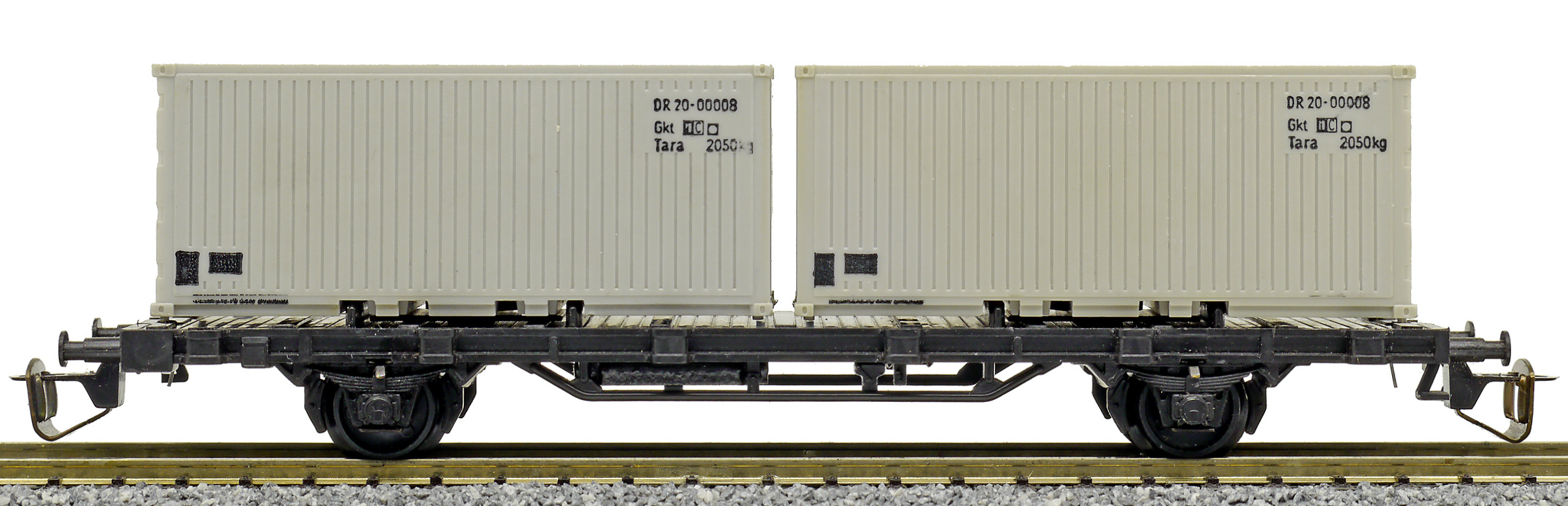 | nákladní plošinový vůz černý se dvěma 20' kontejnery „DR“ |