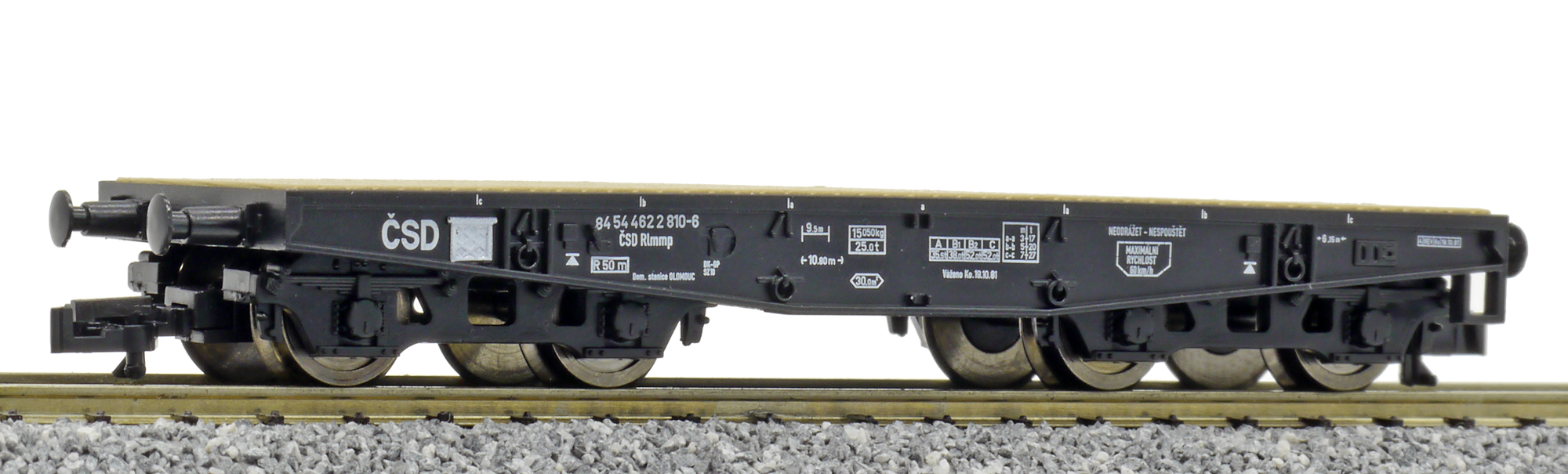 měřítko 1:120 - rozchod kolejí 12 mm kinematika krátkého spřáhla (KKK) podle normy NEM 358 90 mm - celková délka modelu přes nárazníky 4 - celkový počet náprav nebo rozložení náprav 90 g - hmotnost brutto - model včetně prodejního obalu 30 g - hmotnost netto - pouze model