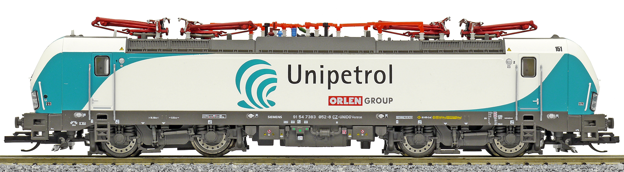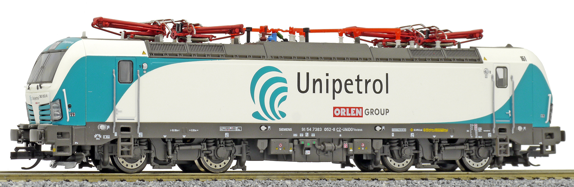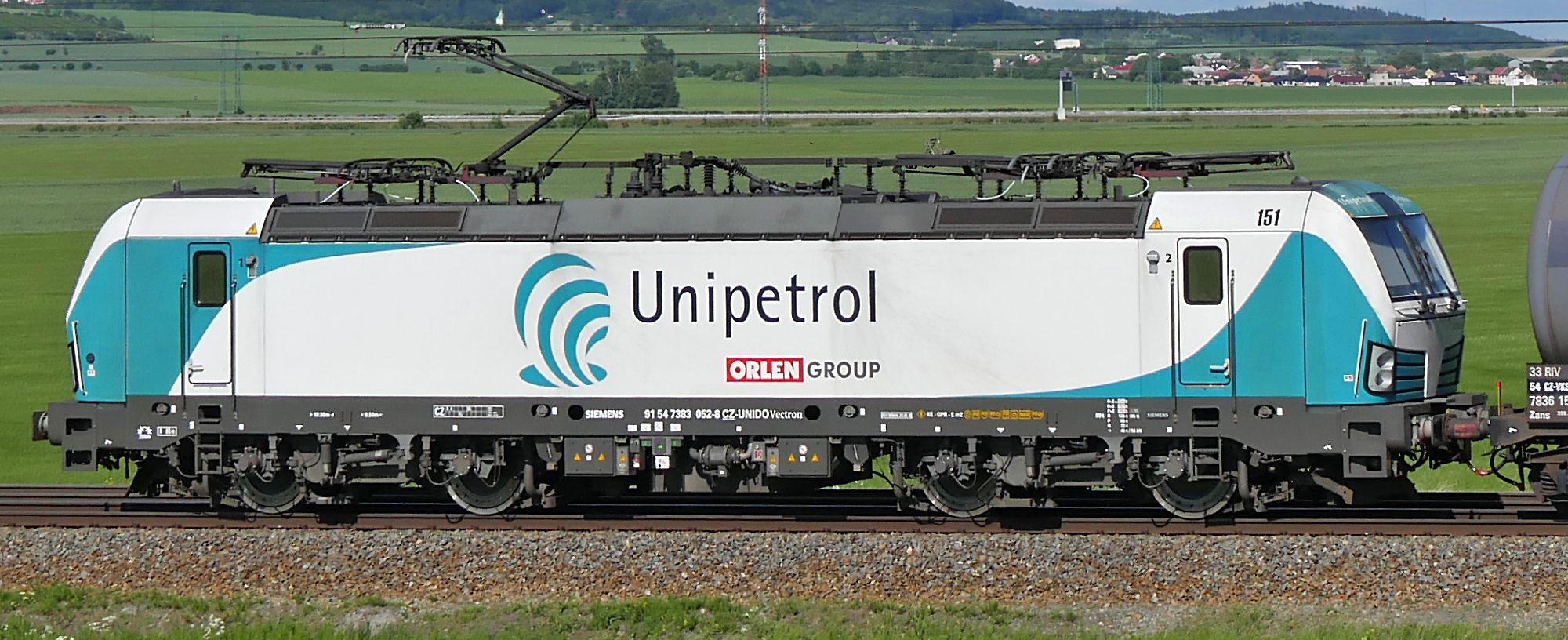 | elektrická lokomotiva v barevném schematu „Unipetrol“ |