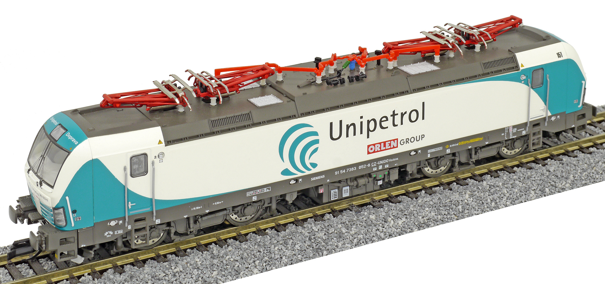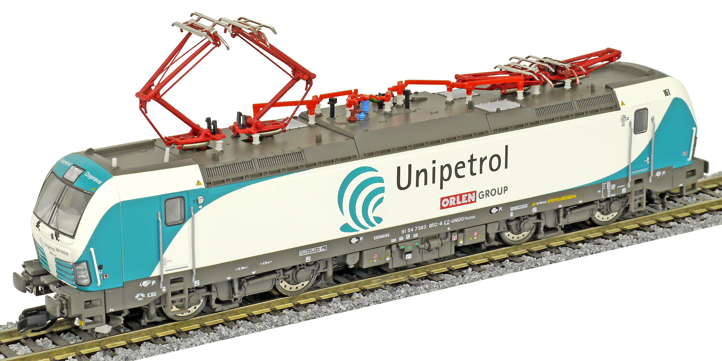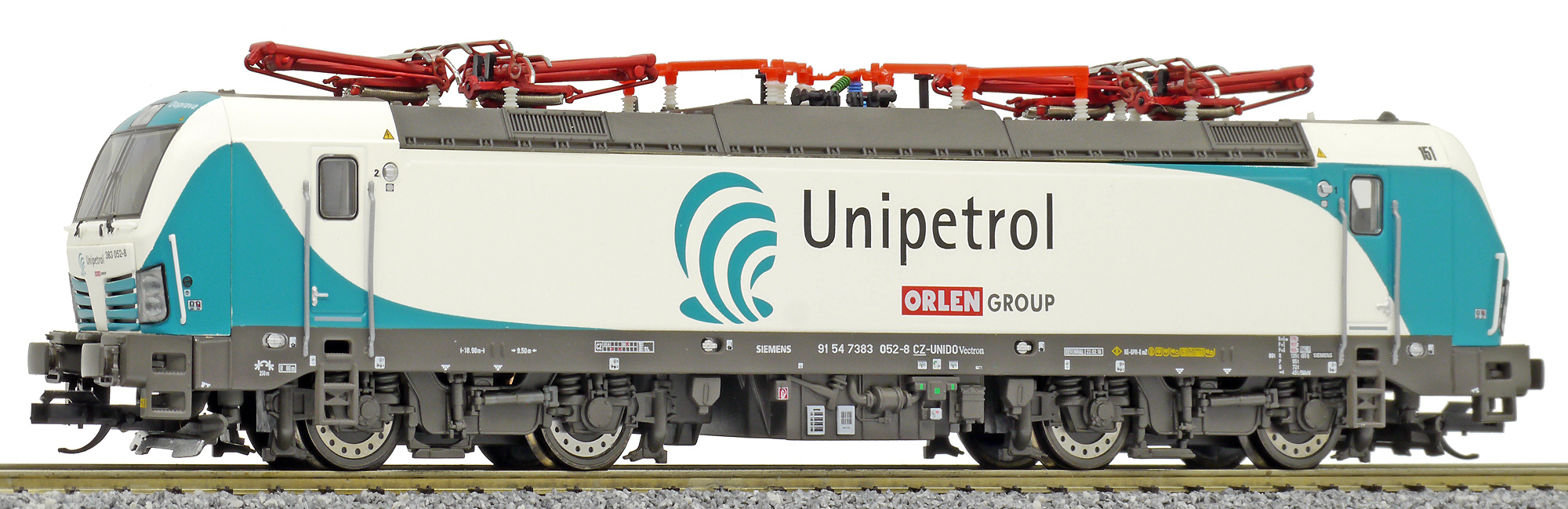 | elektrická lokomotiva v barevném schematu „Unipetrol“ |