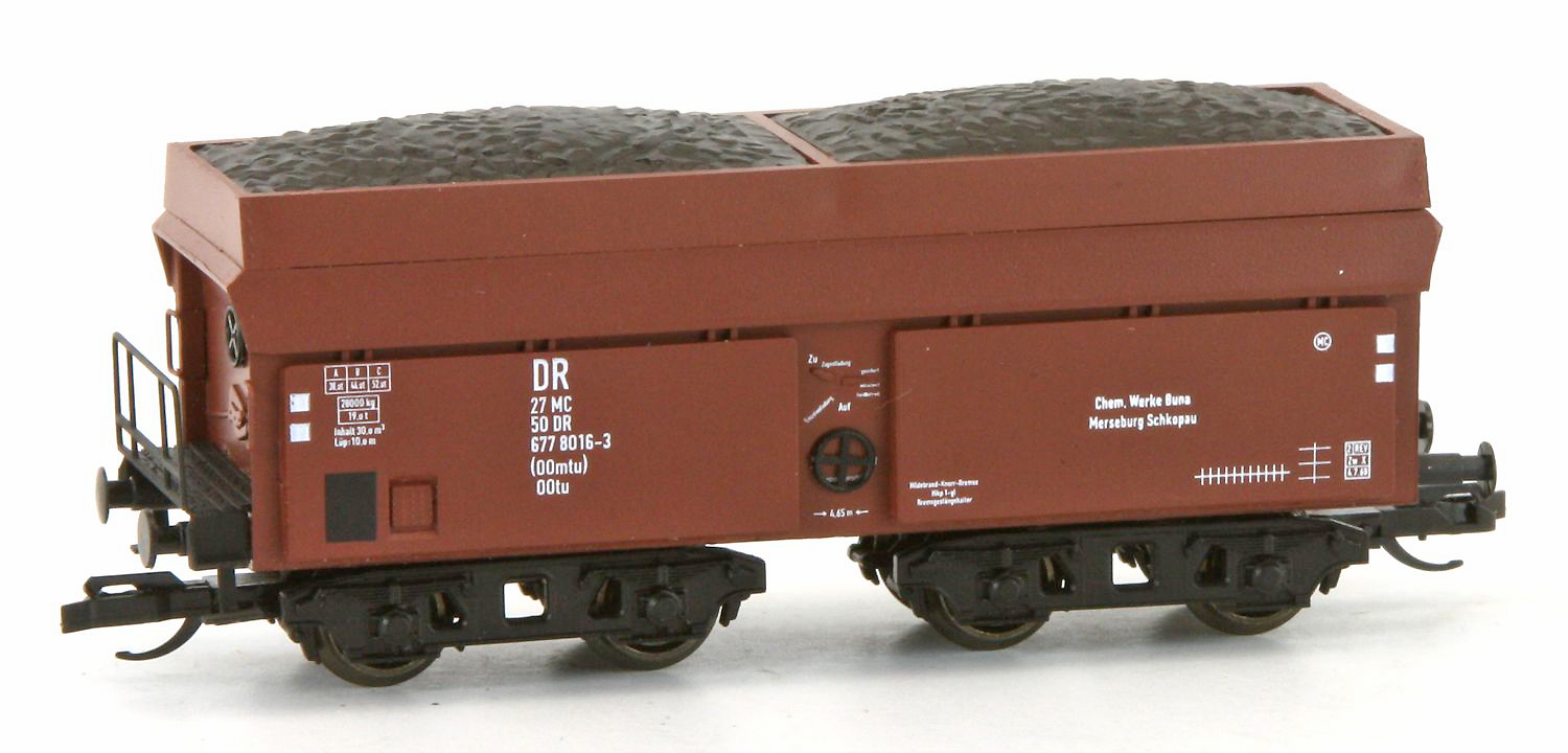 | nákladní samovýsypný vůz červenohnědý „Bunawerke“ s nákladem hnědého uhlí |