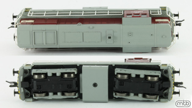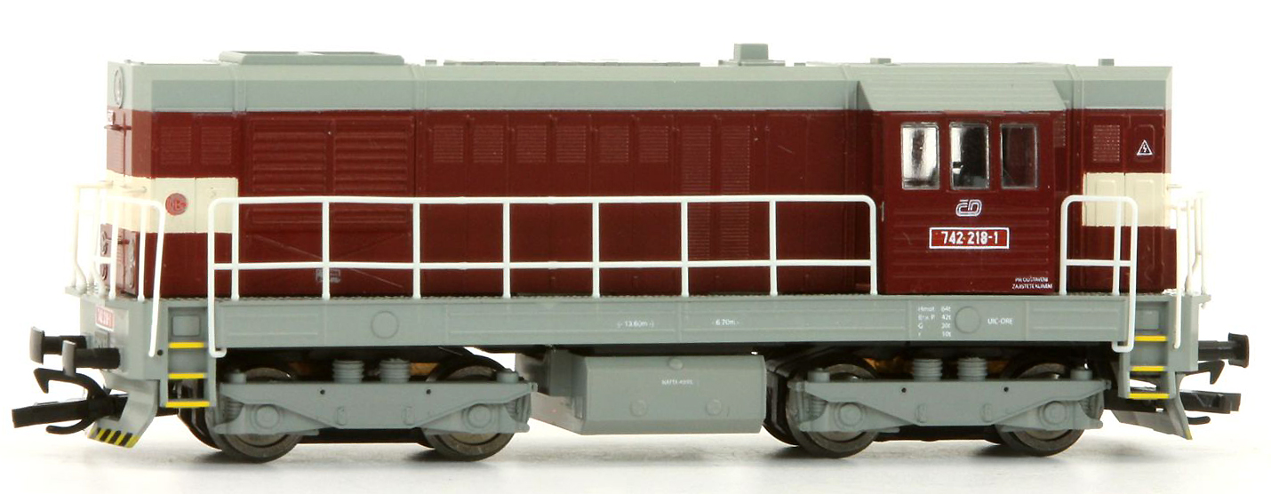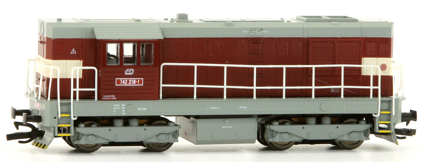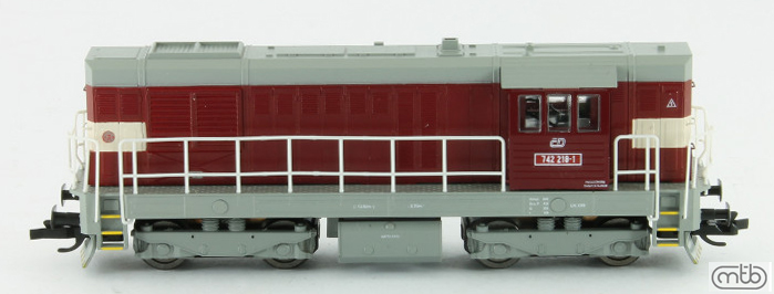 Popis   dieselová lokomotiva červená s šedou střechou, rámem a pojezdem a výstražným pruhem