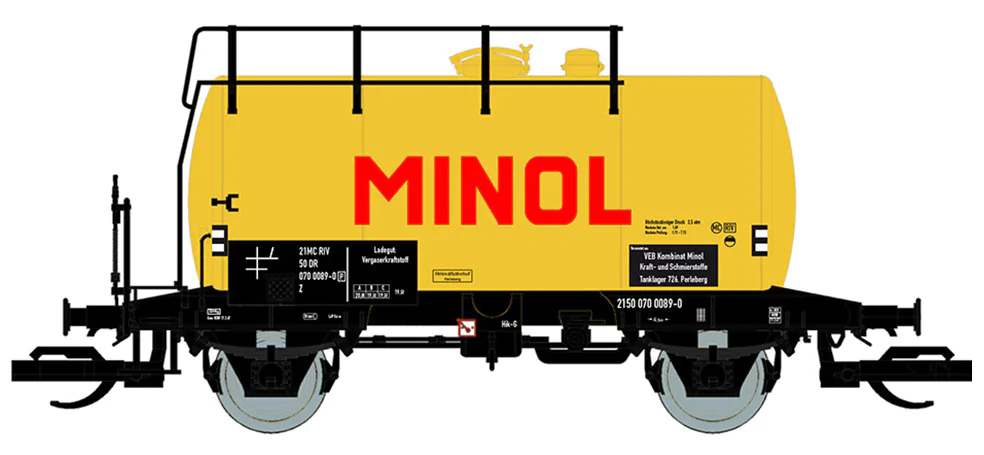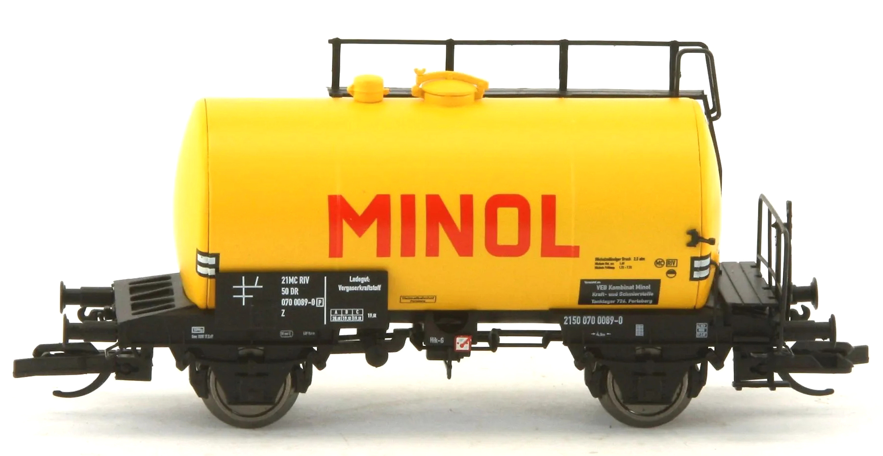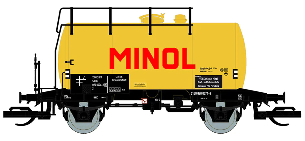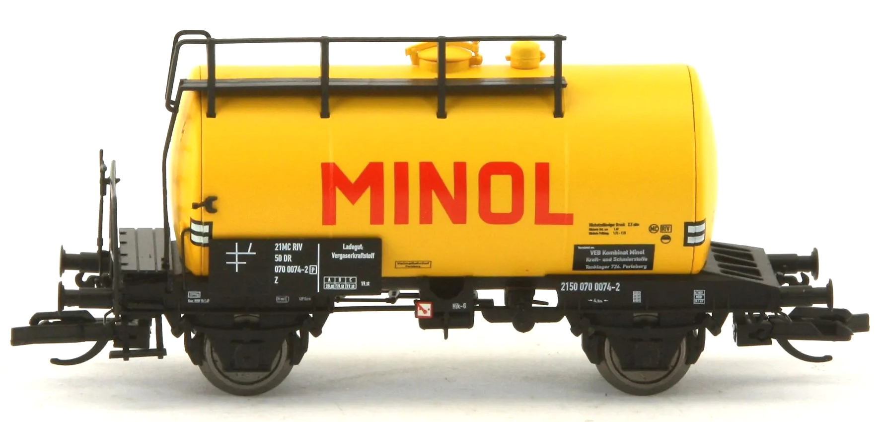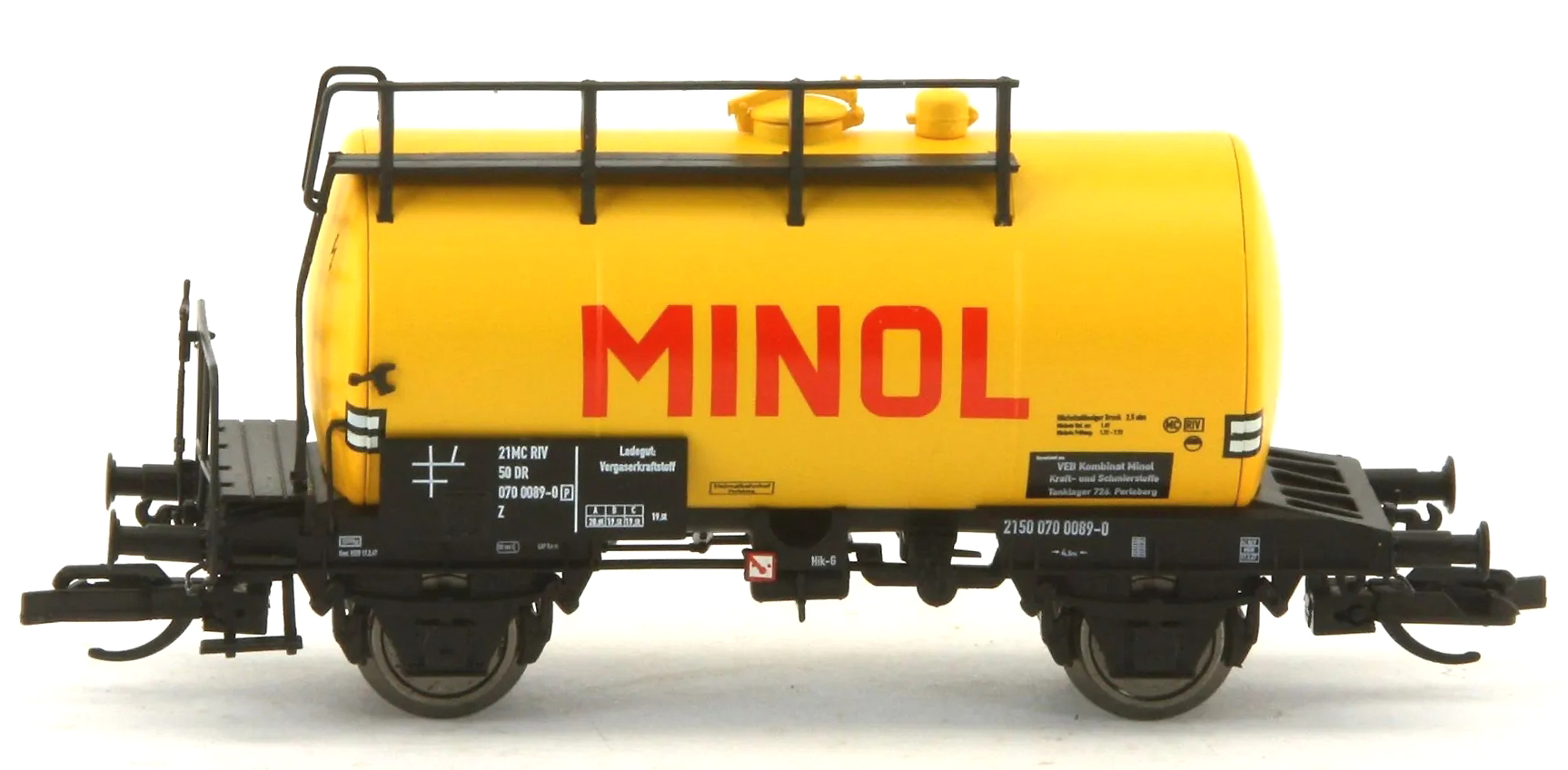| set tří žlutých kotlových vozů s logem „MINOL“ |