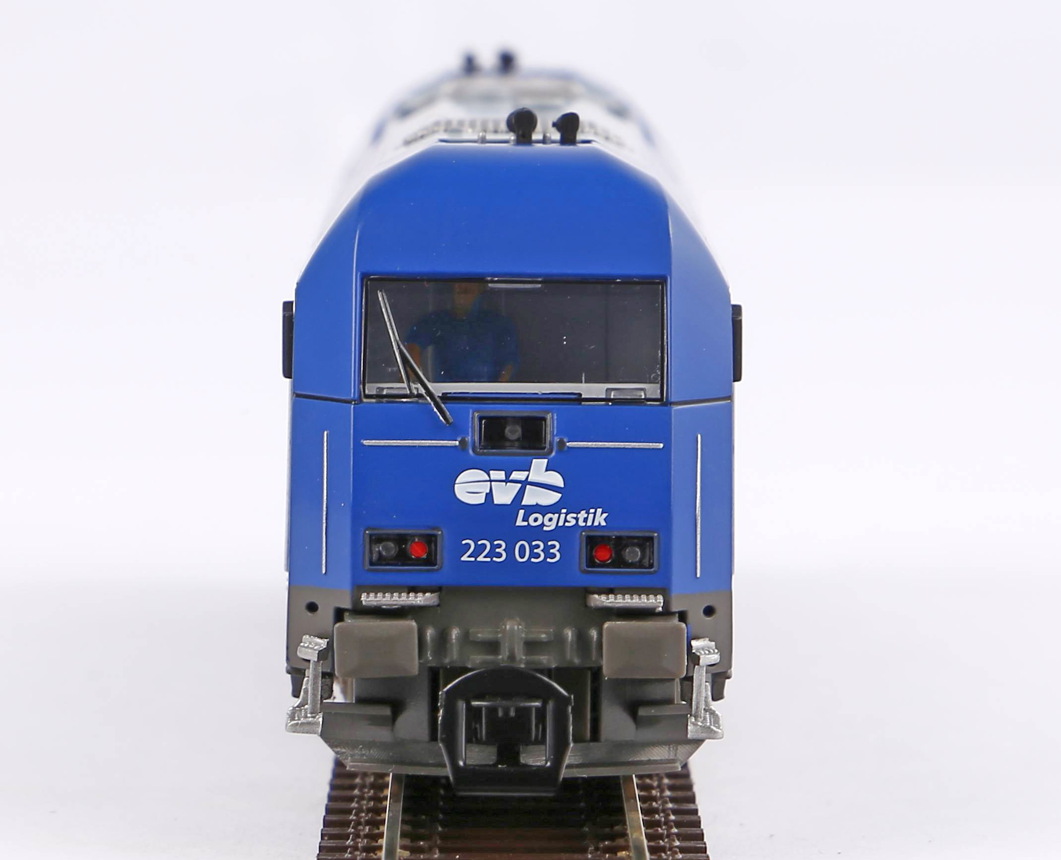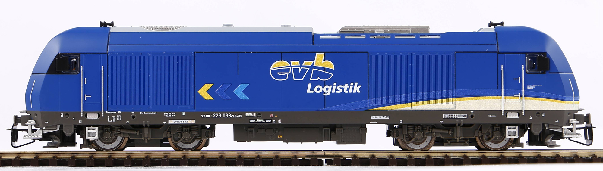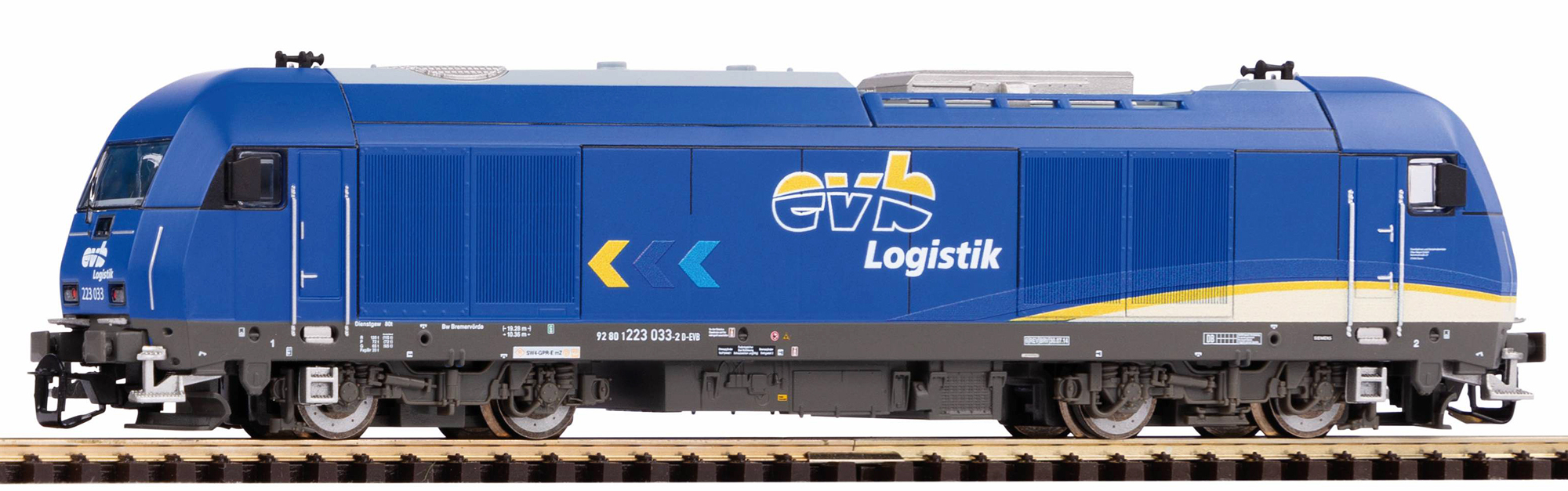 | dieselová lokomotiva v modrém barevném schematu „evb Logistik“ |