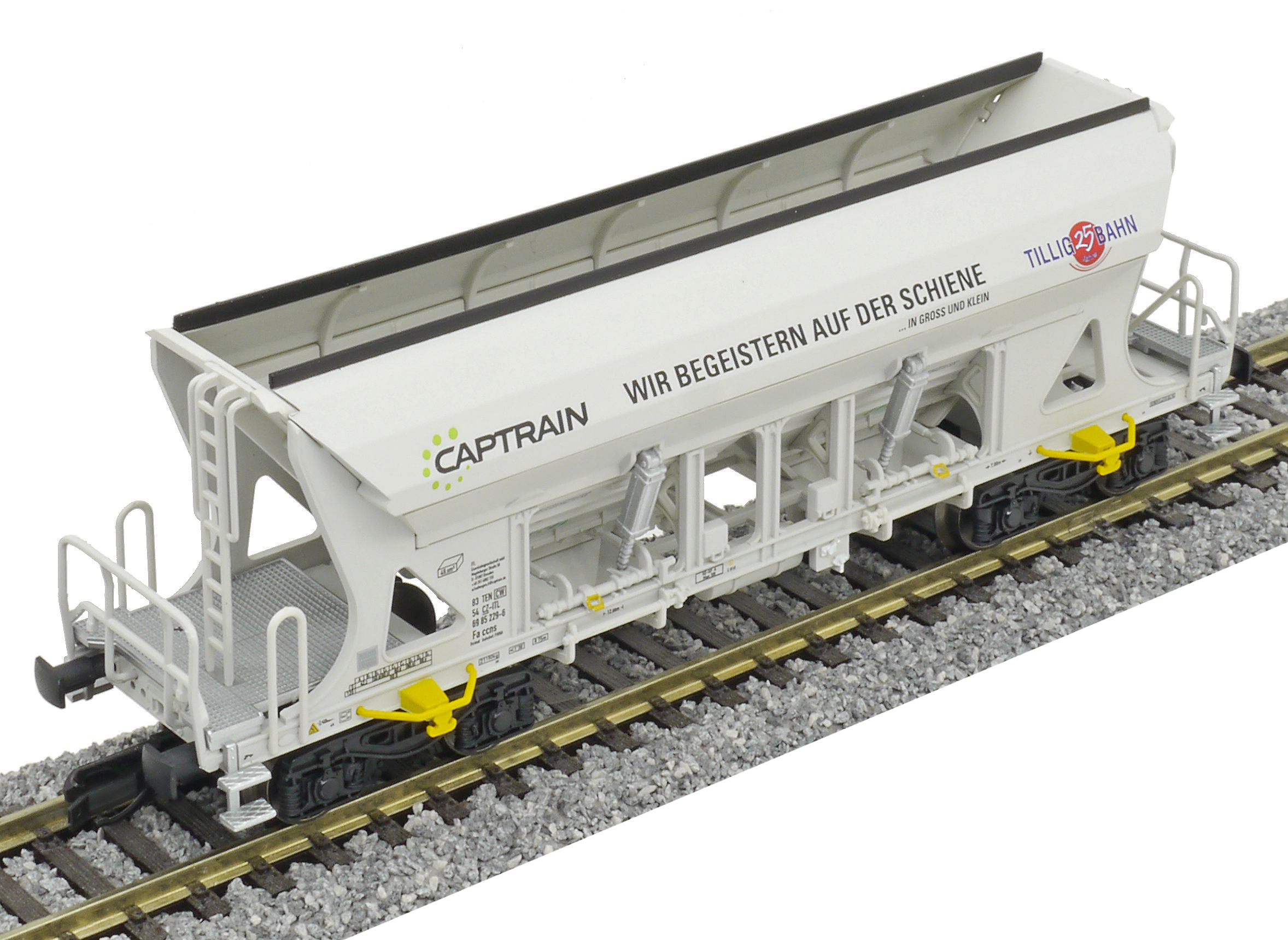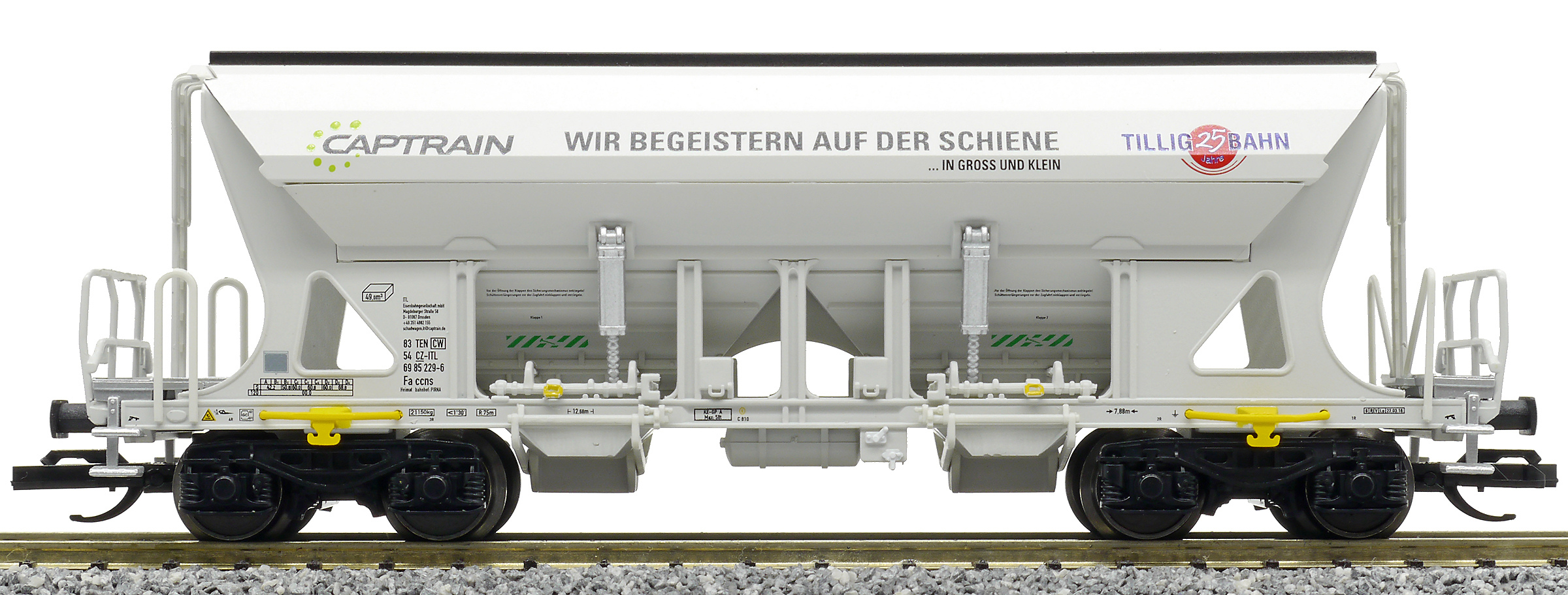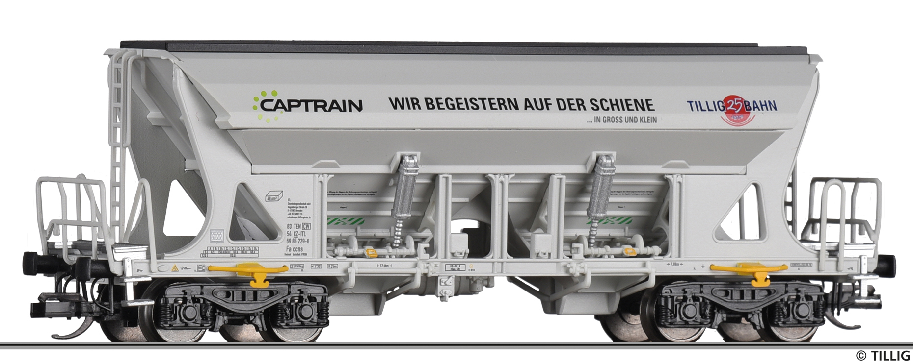 | nákladní samovýsypný vůz šedý s potiskem „Captrain/TILLIG“ |