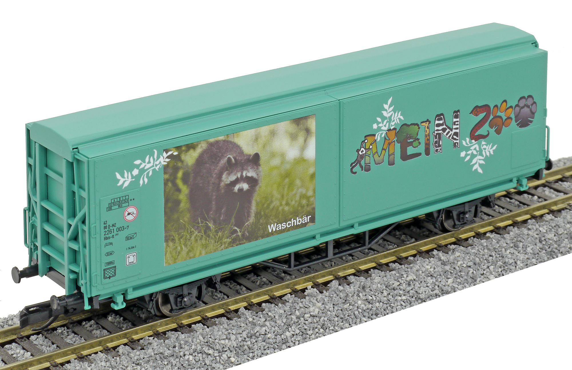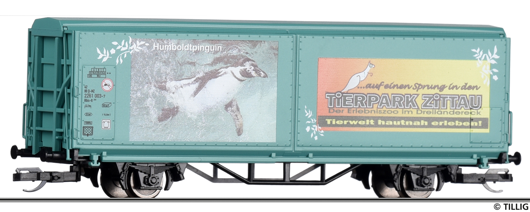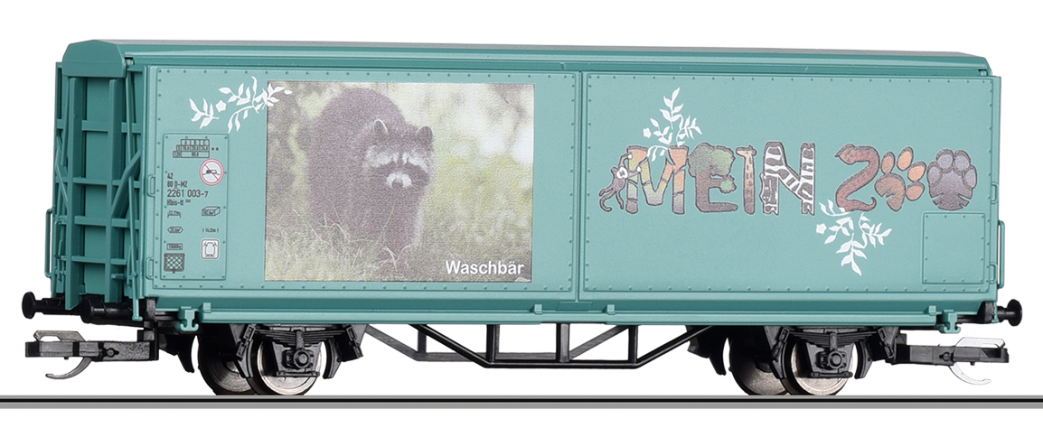 | krytý nákladní vůz s posuvnými stěnami a s reklamním potiskem „Mein Zoo” |