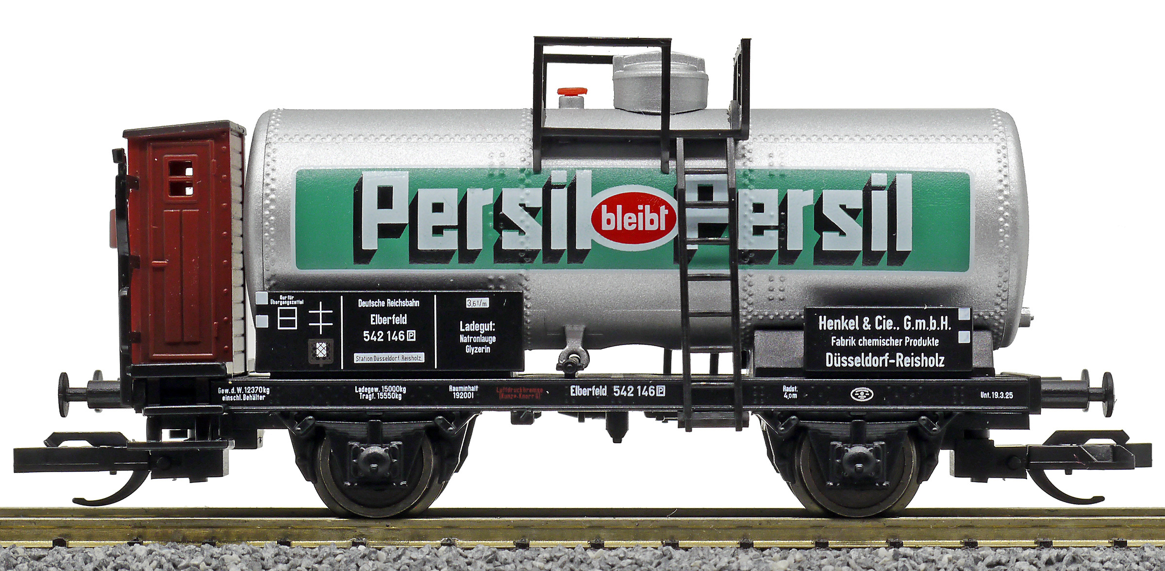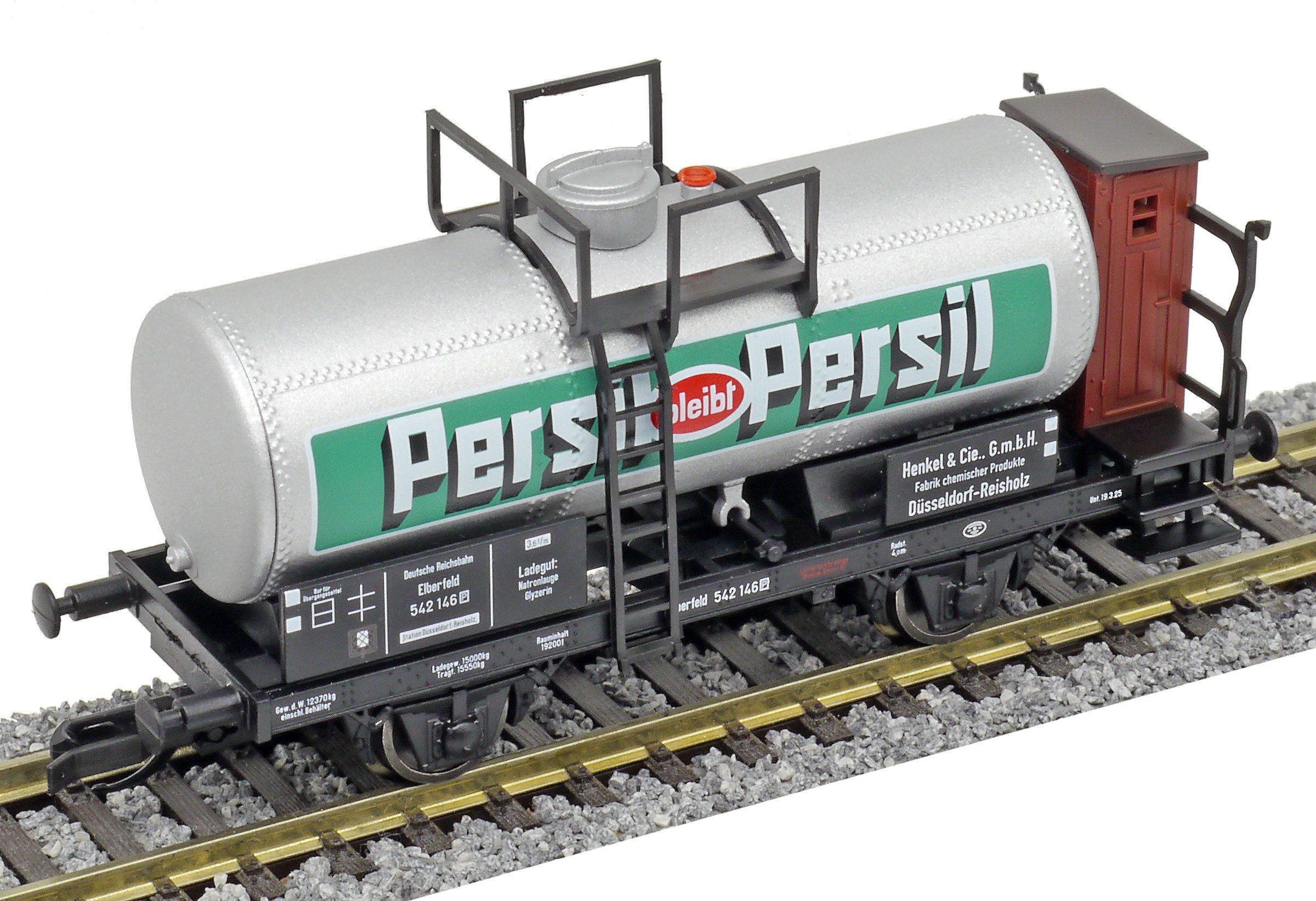 | kotlový nákladní vůz stříbrný s brzdařskou budkou „Persil“ |