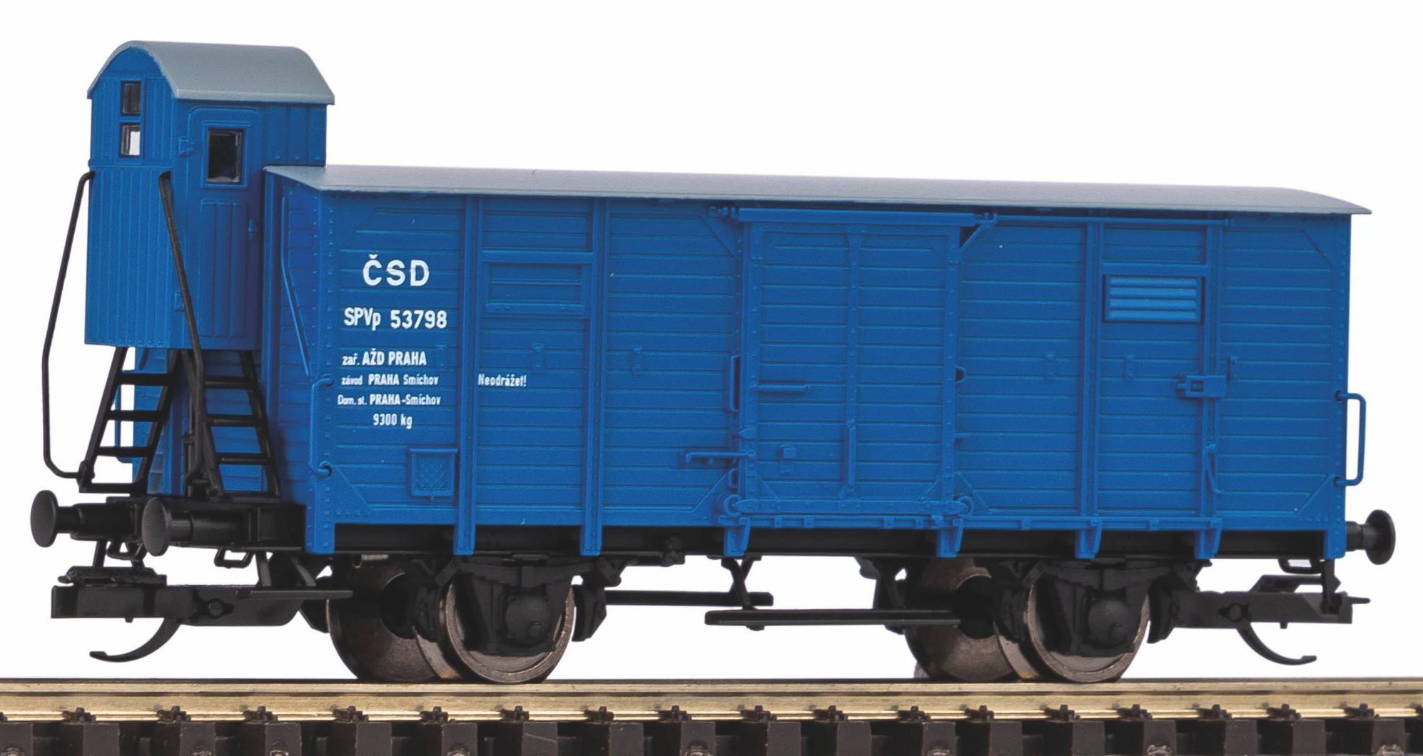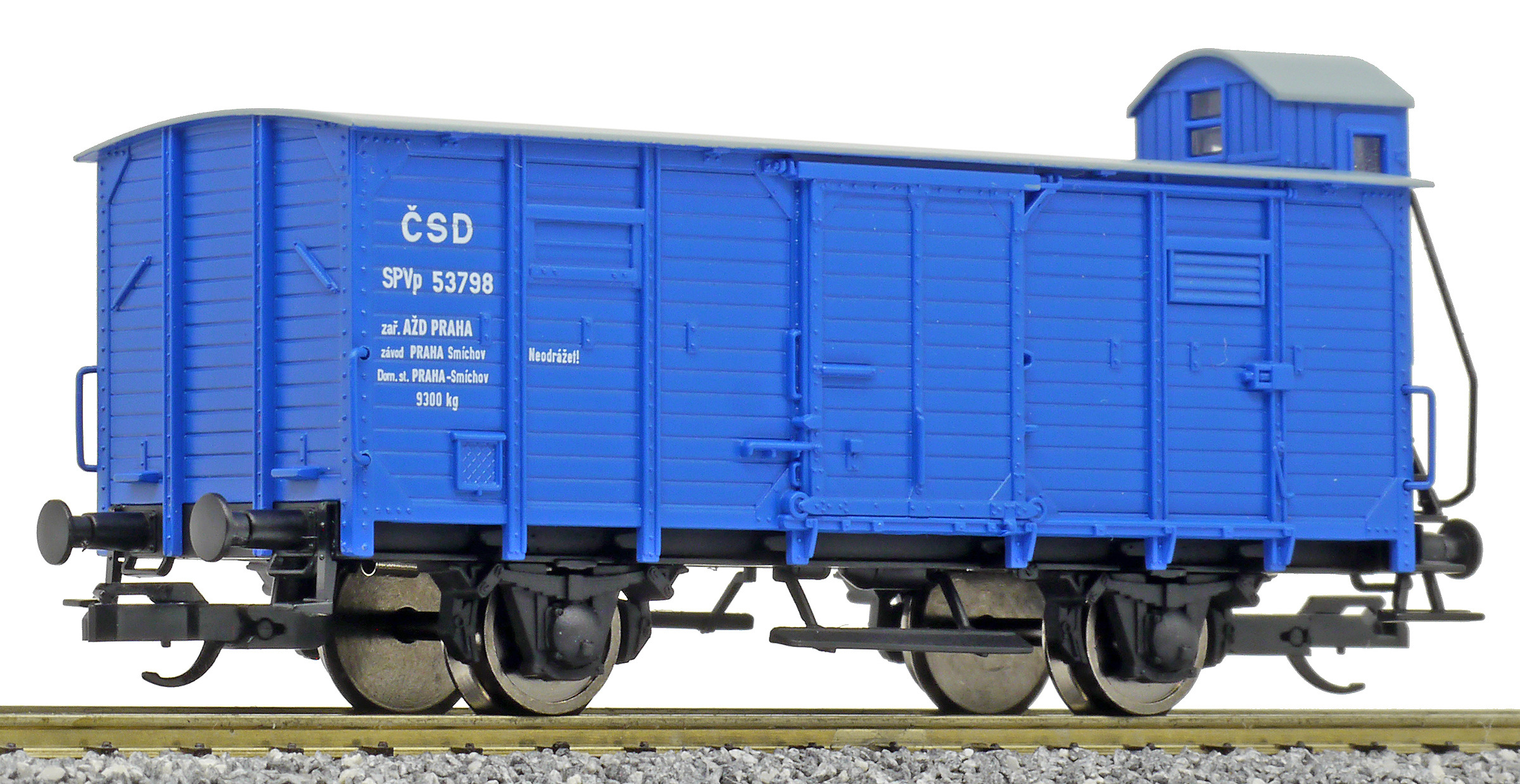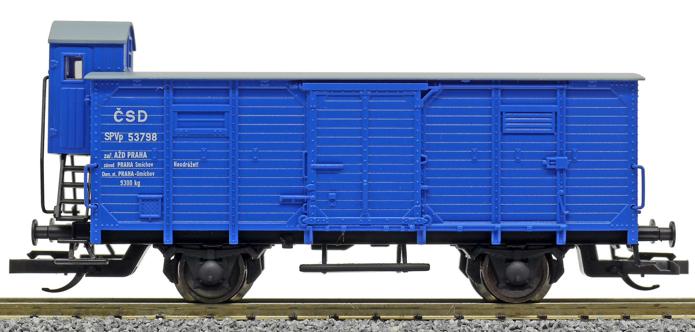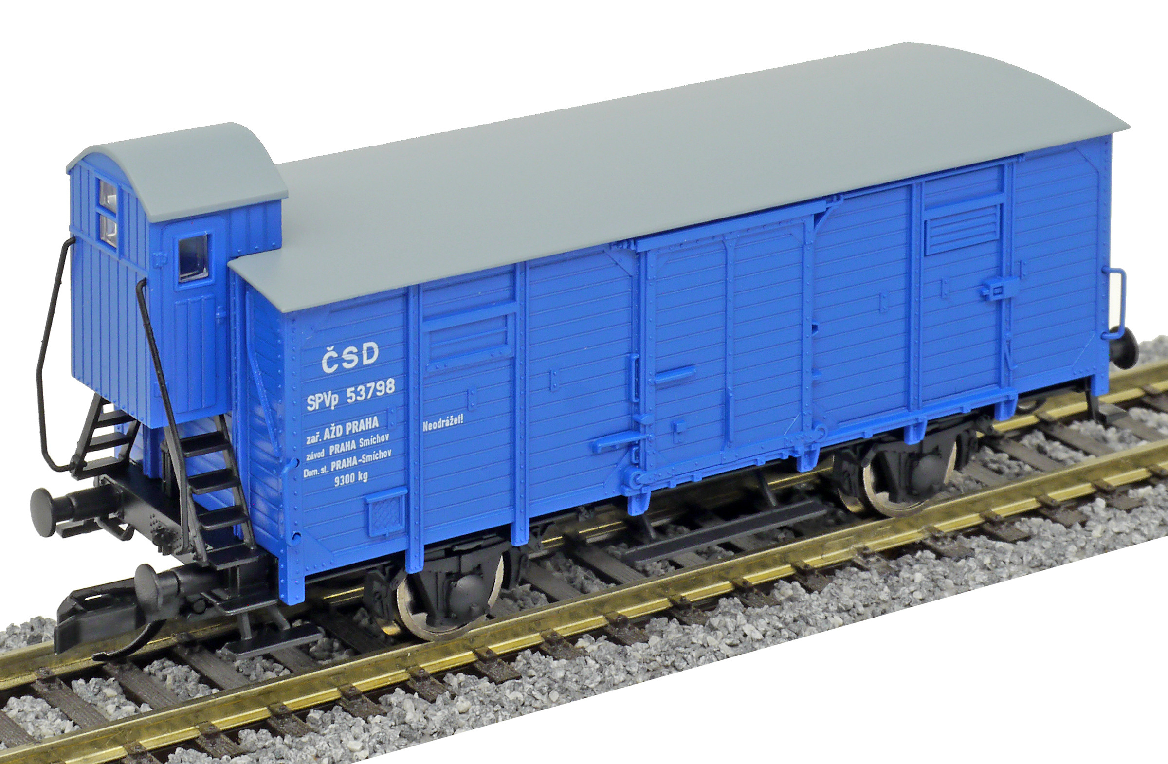 Popis   krytý nákladní vůz modrý s černou střechou a s brzdařskou budkou