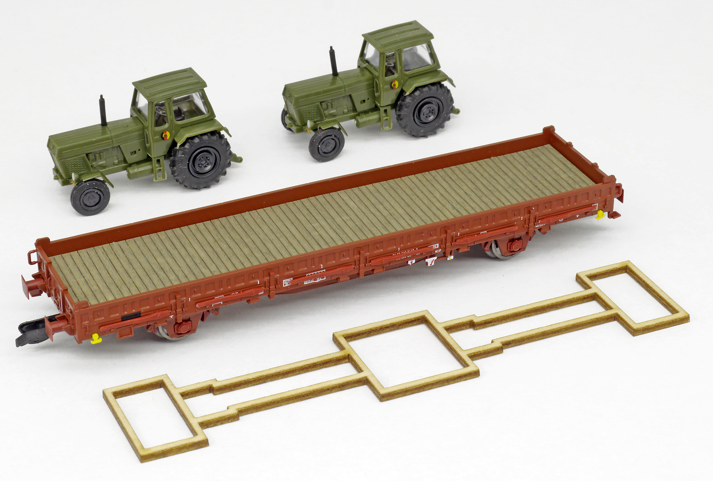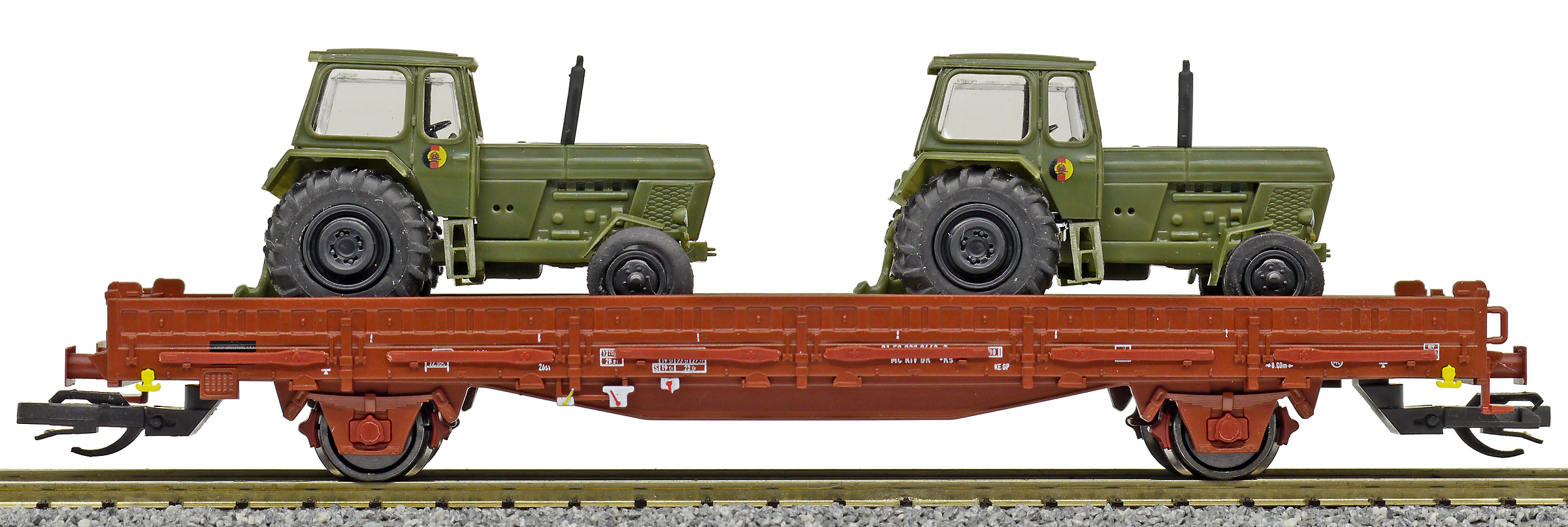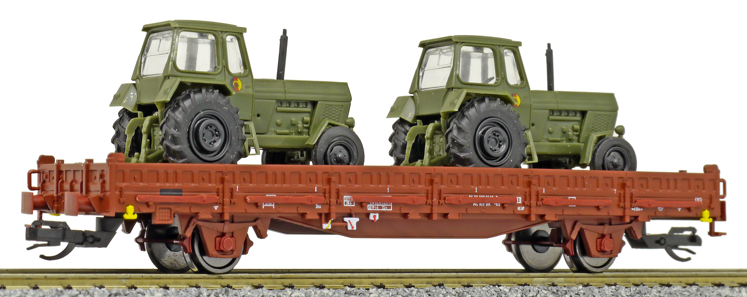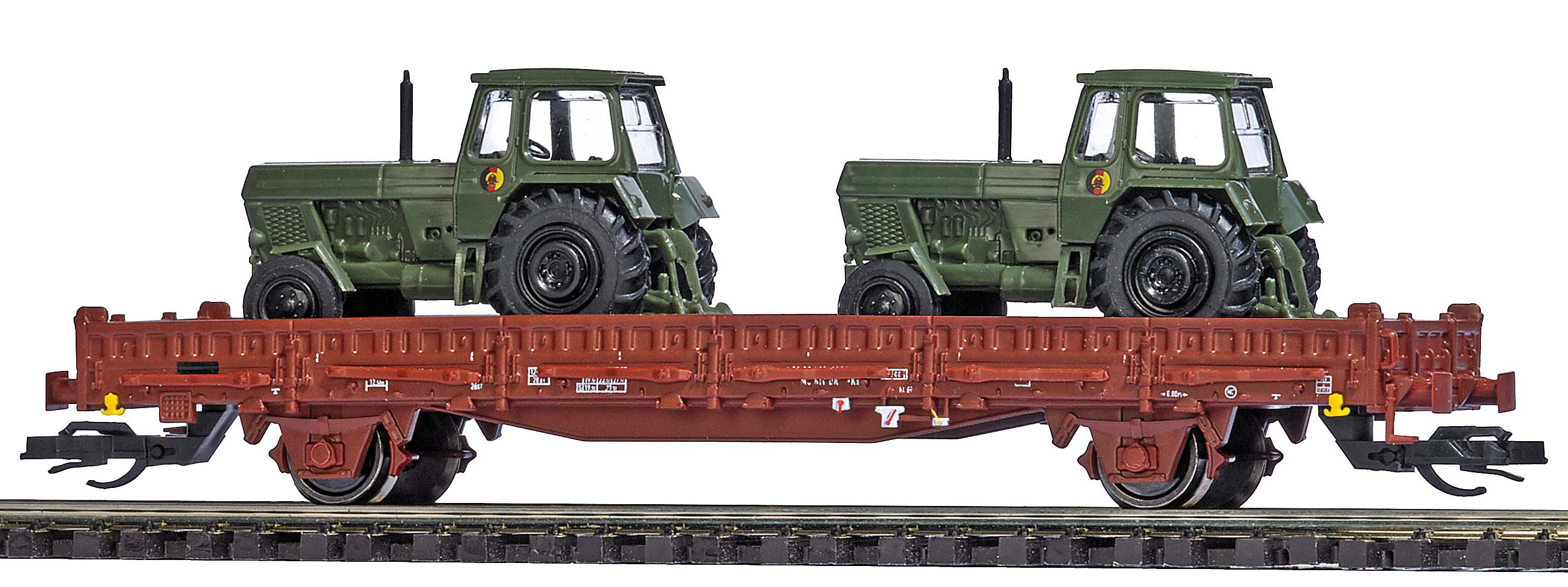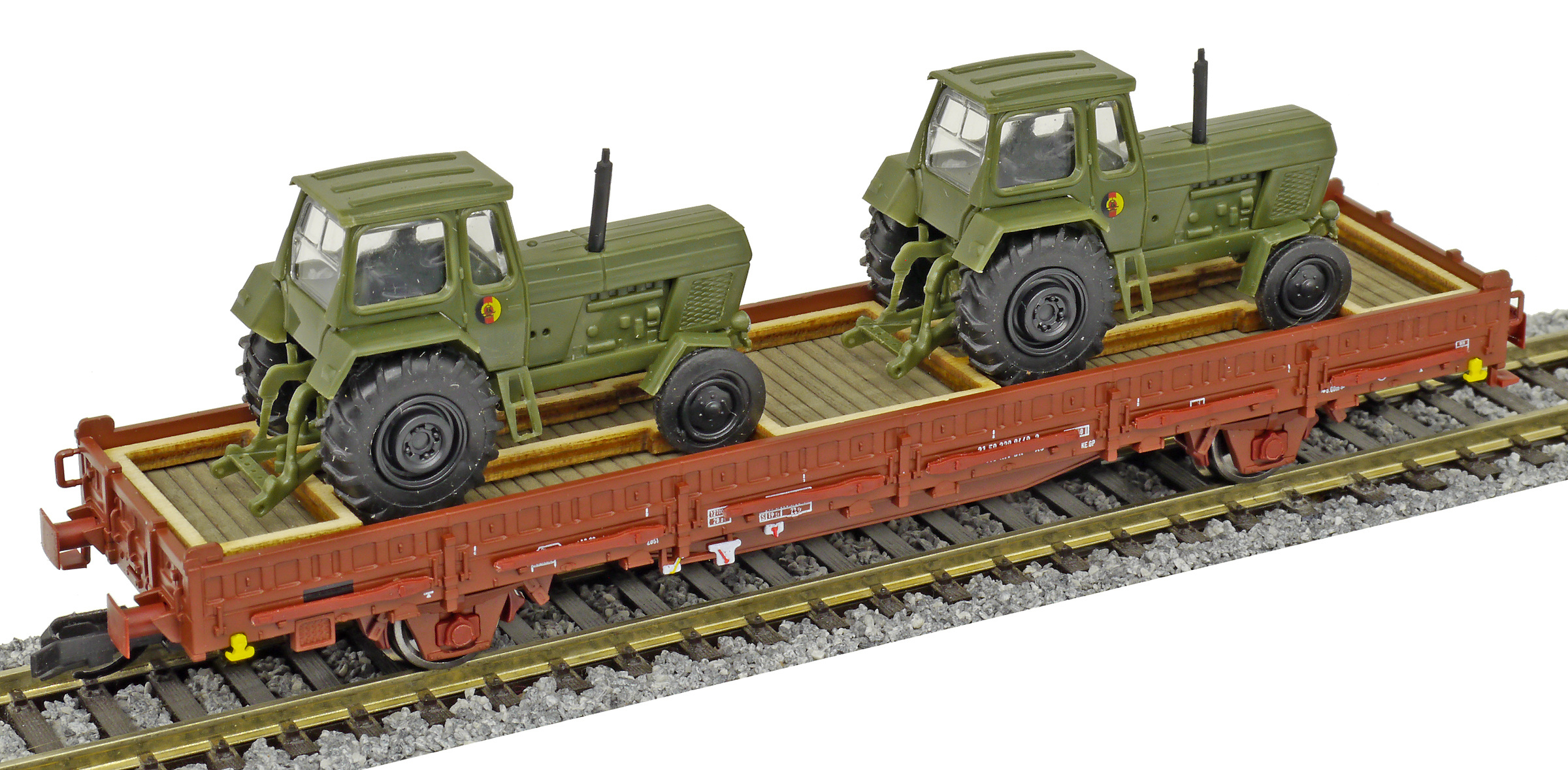 | nízkostěnný nákladní vůz červenohnědý s klanicemi s nákladem dvou traktorů ZT 300 NVA |