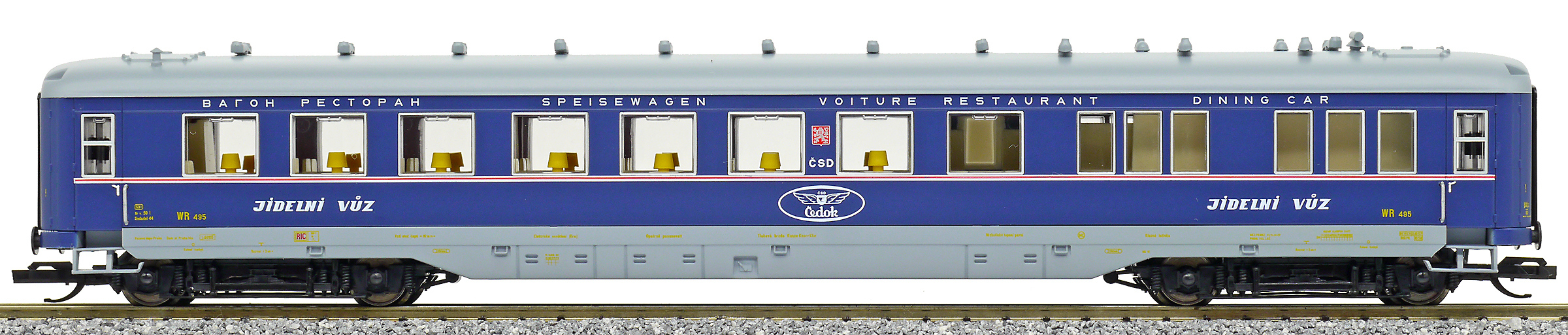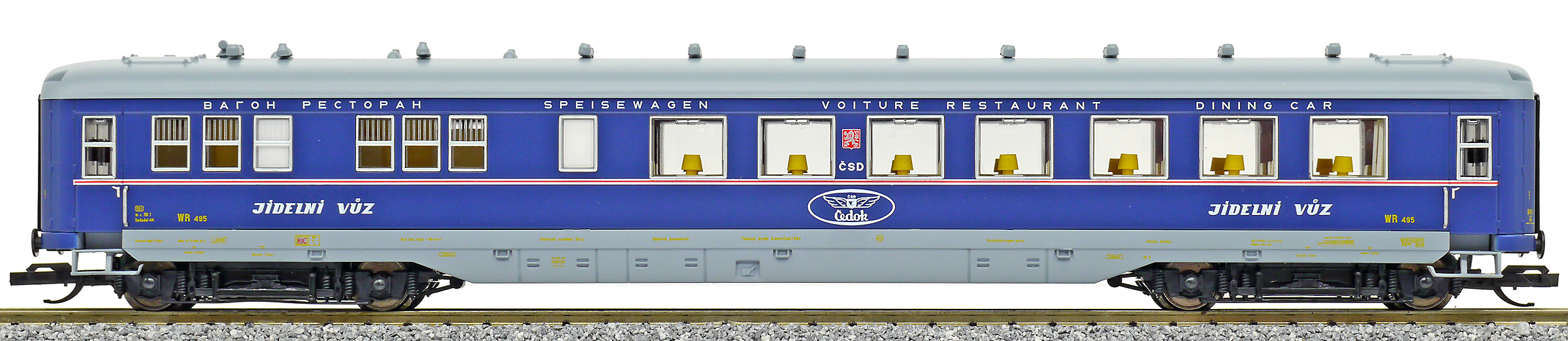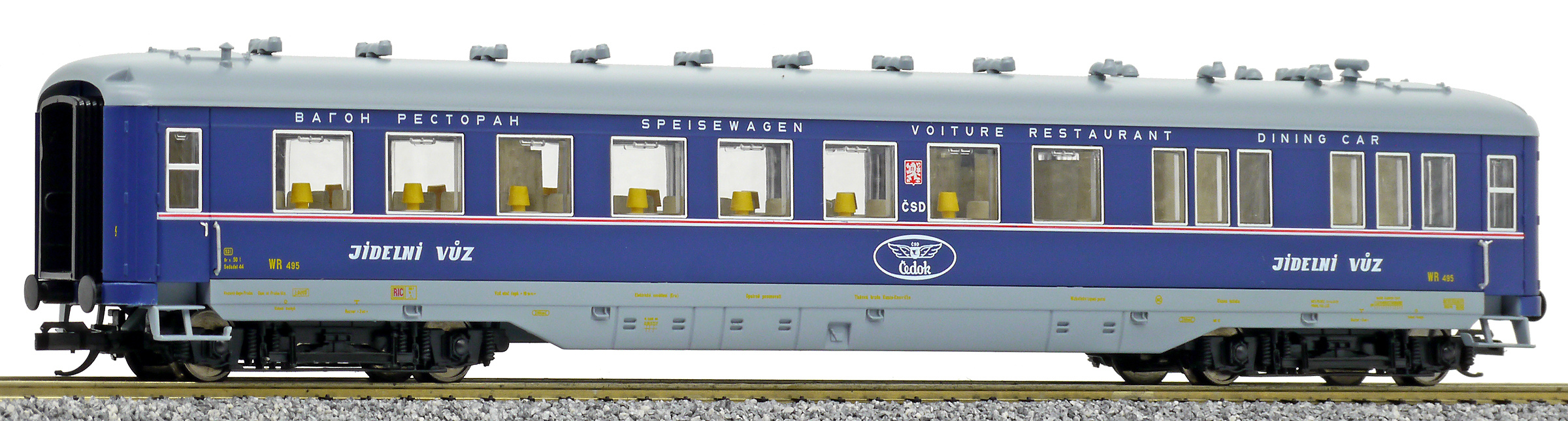 | jídelní vůz modrý s šedou střechou s logem „ČEDOK“ |