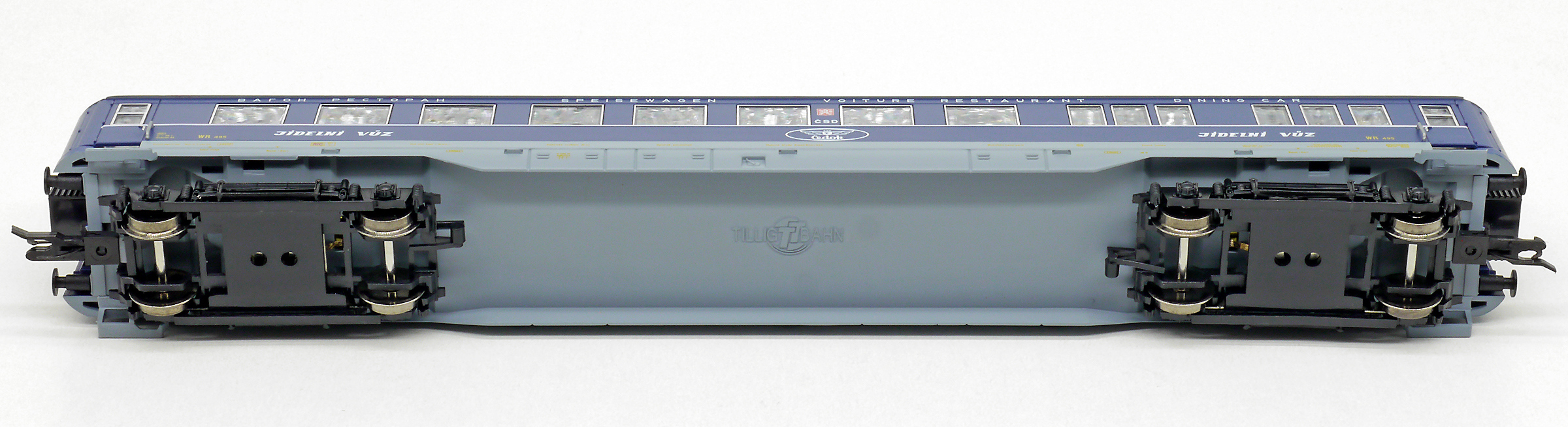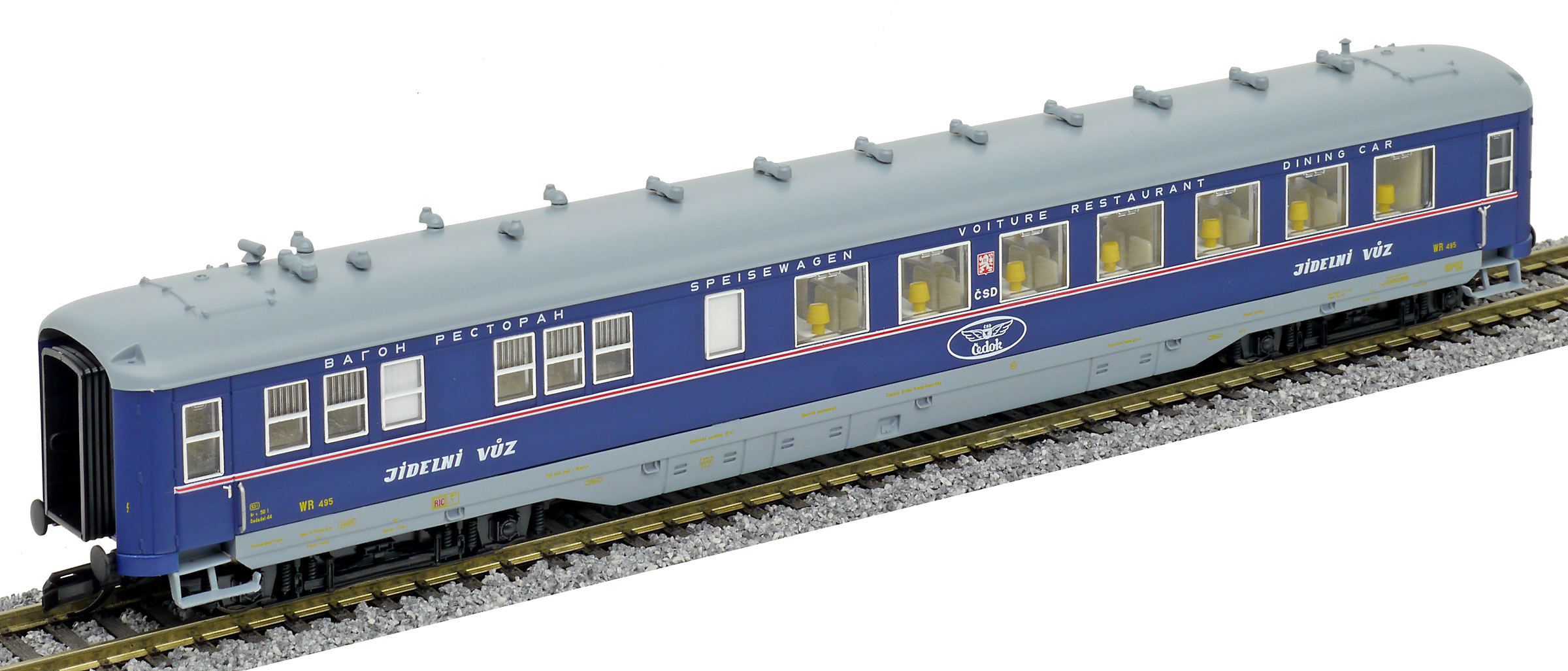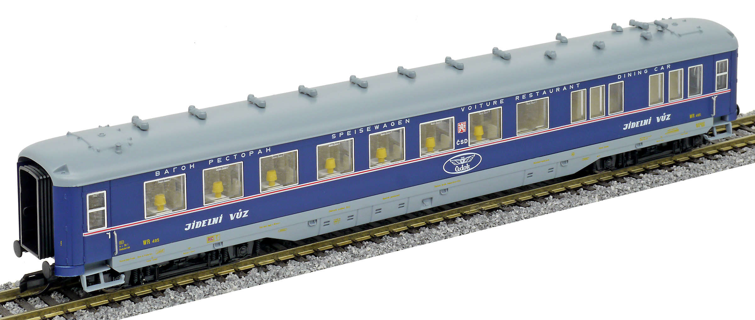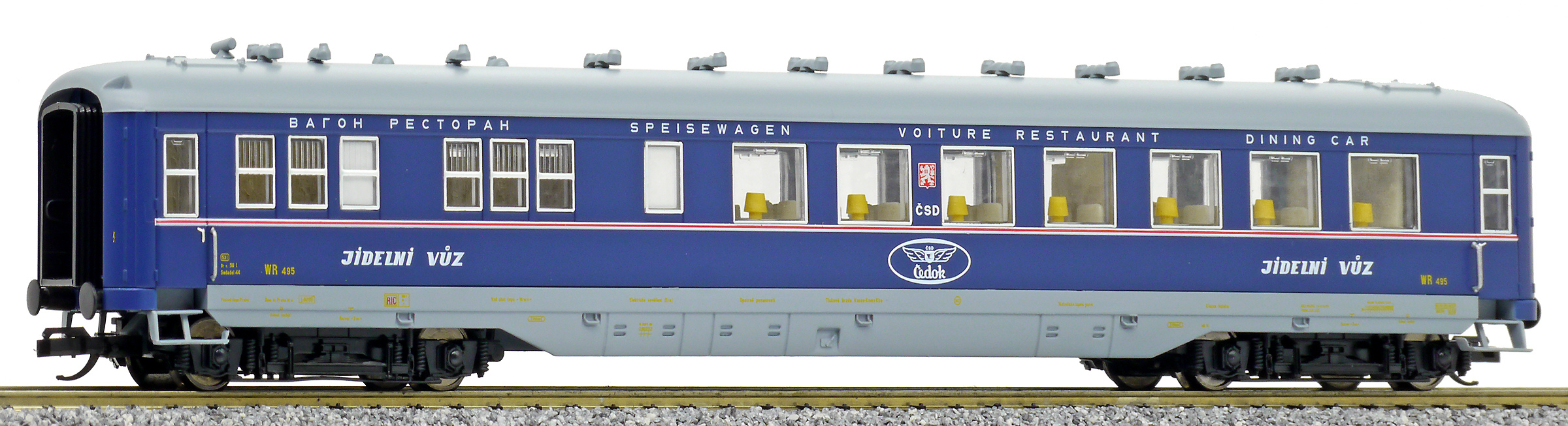 | jídelní vůz modrý s šedou střechou s logem „ČEDOK“ |