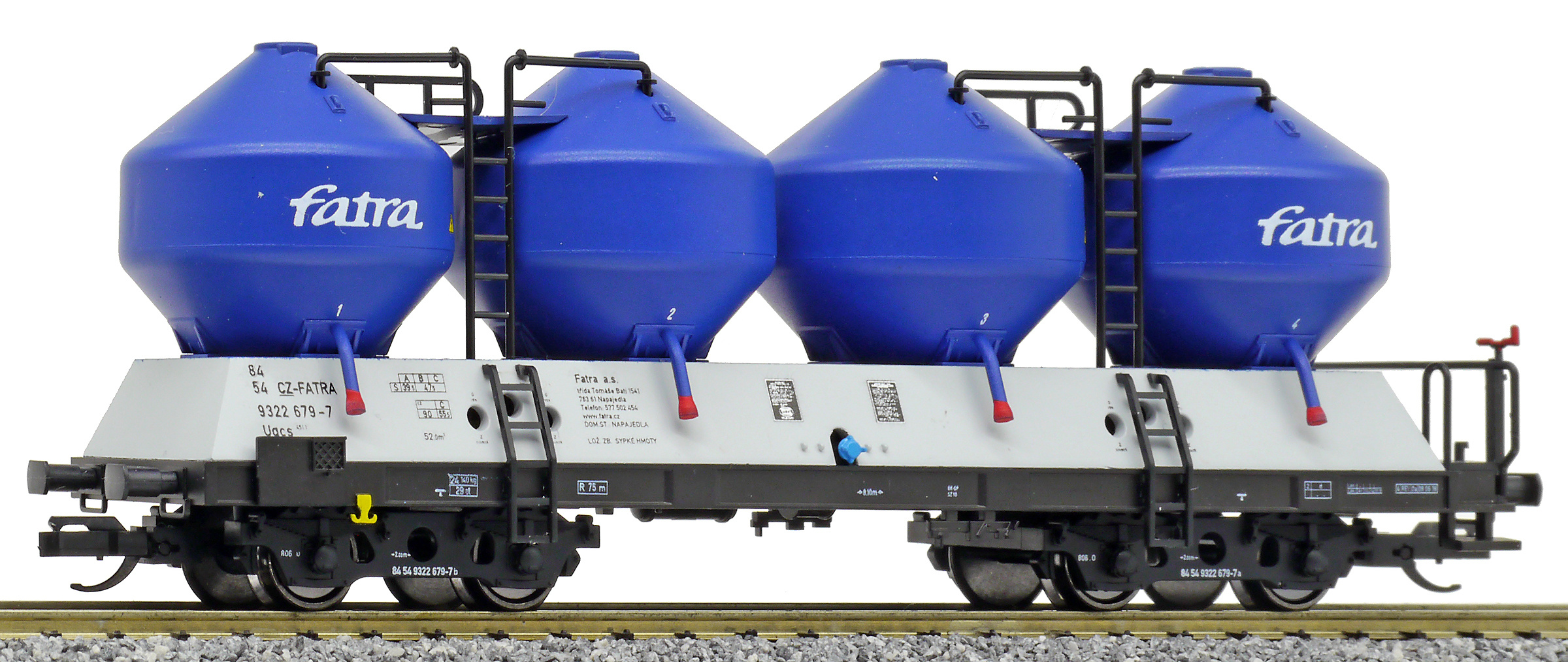 | nákladní samovýsypný vůz šedý-modrá skříň s modrými nádobami a s logem „Fatra“ |