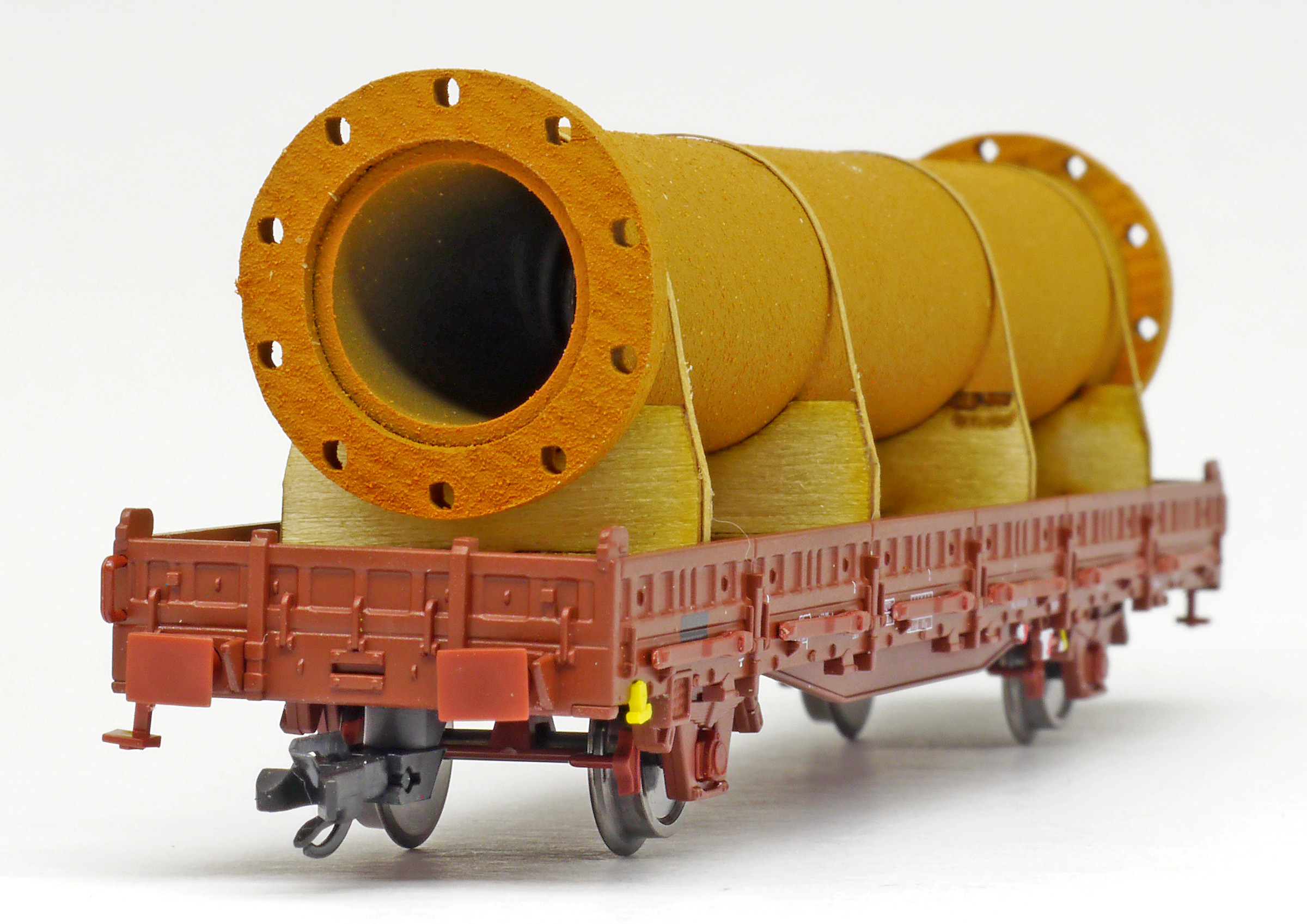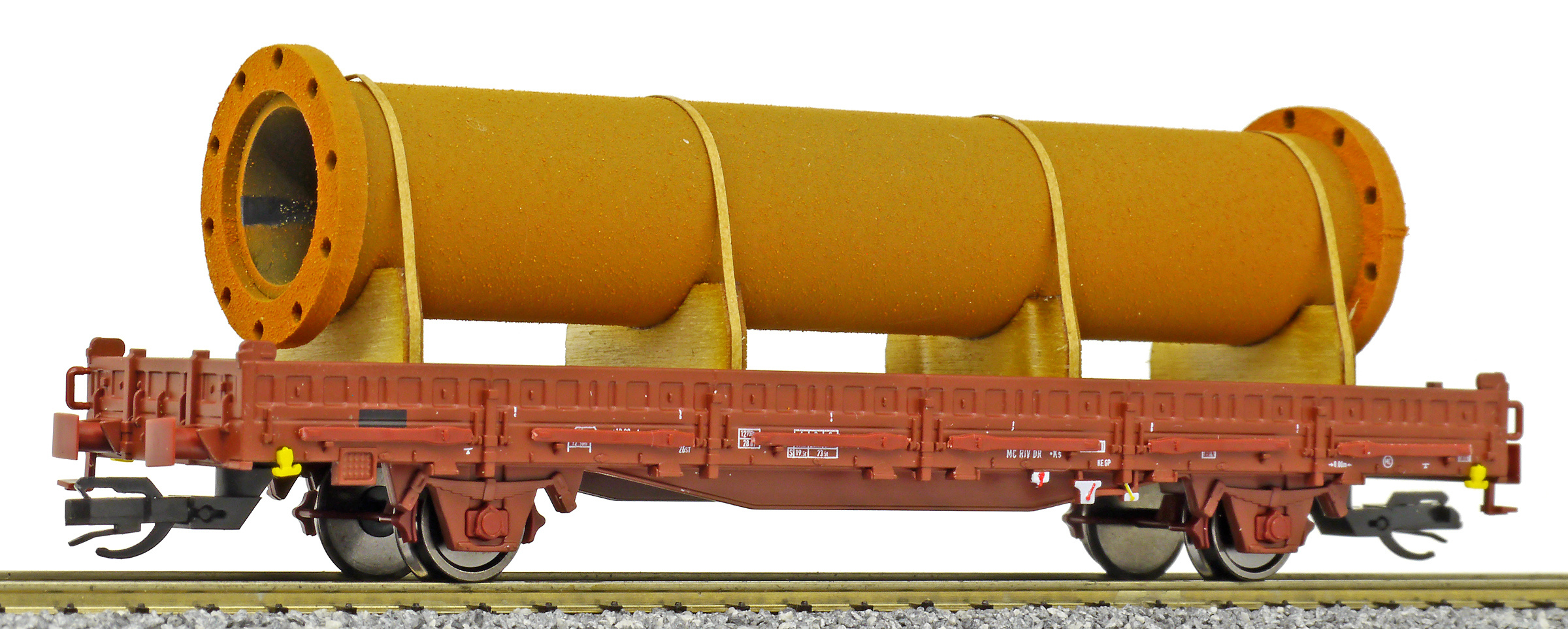| nízkostěnný nákladní vůz červenohnědý s klanicemi s nákladem přírubové trubky |