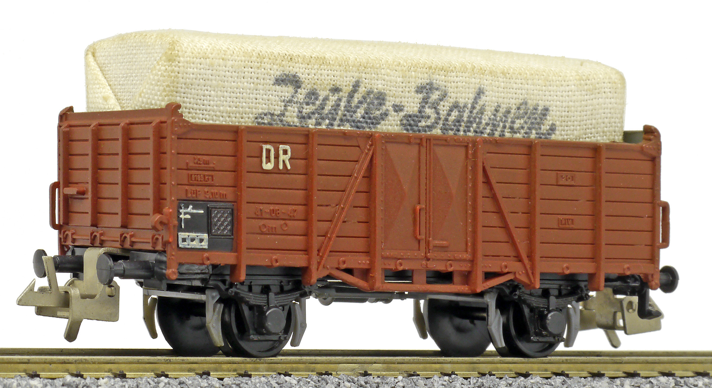 otevřený nákladní vůz červenohnědý s nákladem krytým plachtou „Zeuke-Bahnen“