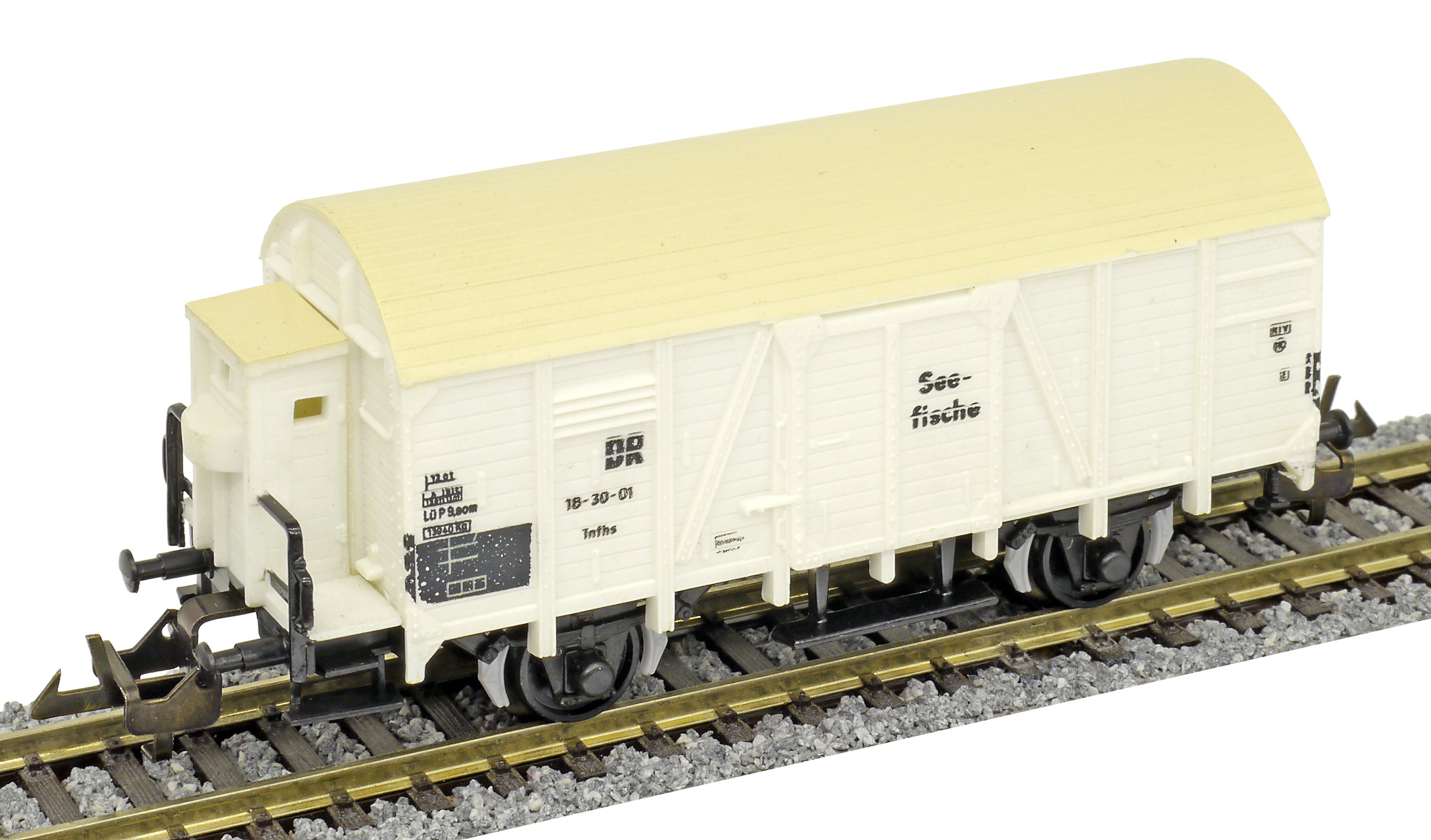 nákladní chladící vůz bílý s krémovou střechou a s brzdařskou budkou na přepravu ryb „Seefische“