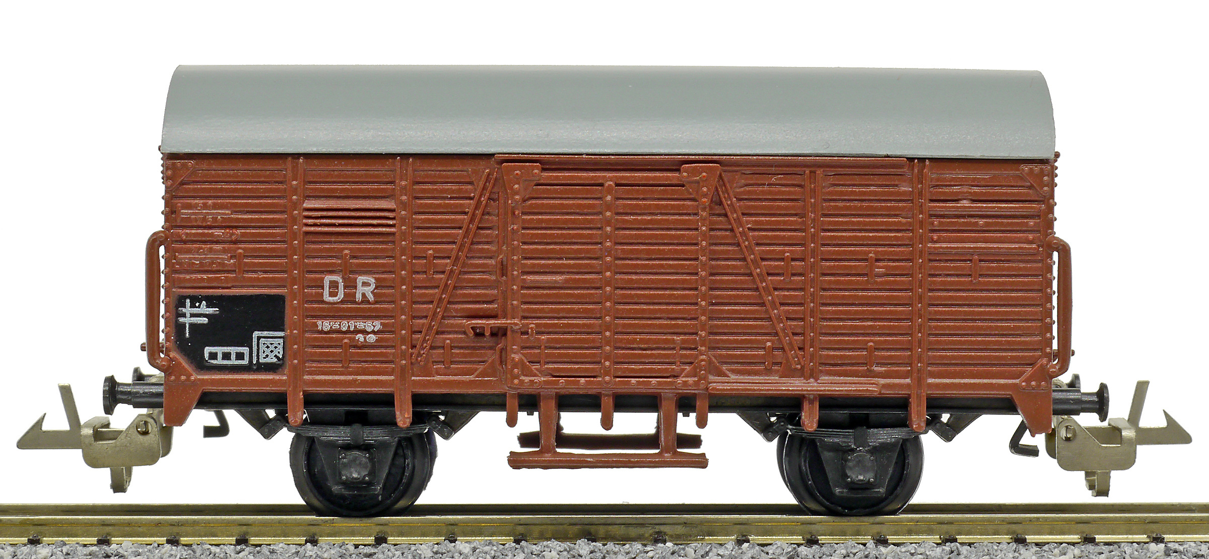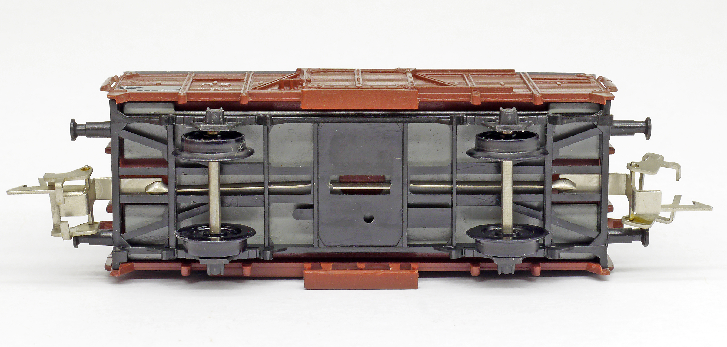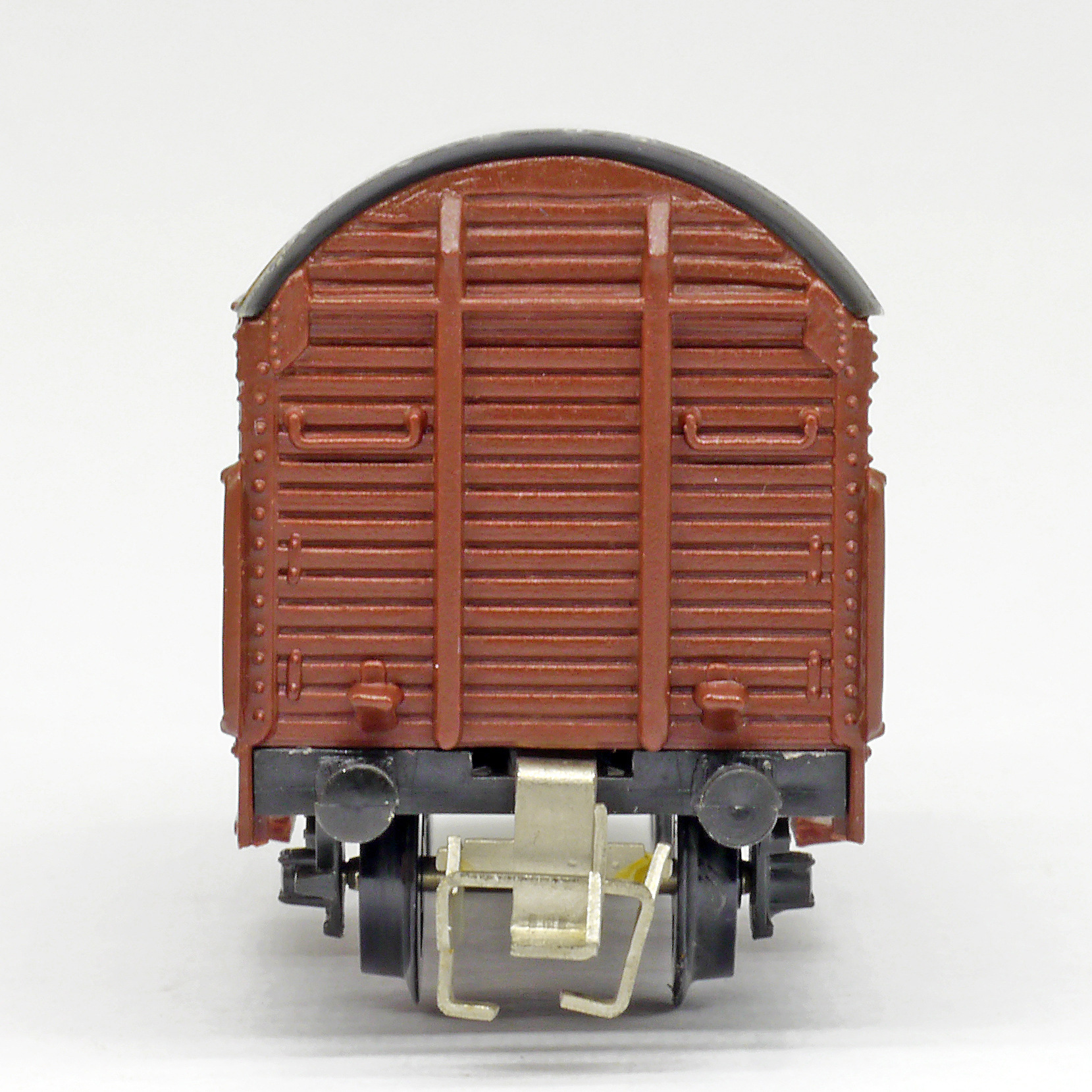 | krytý nákladní vůz červenohnědý s šedou střechou, bez brzd |